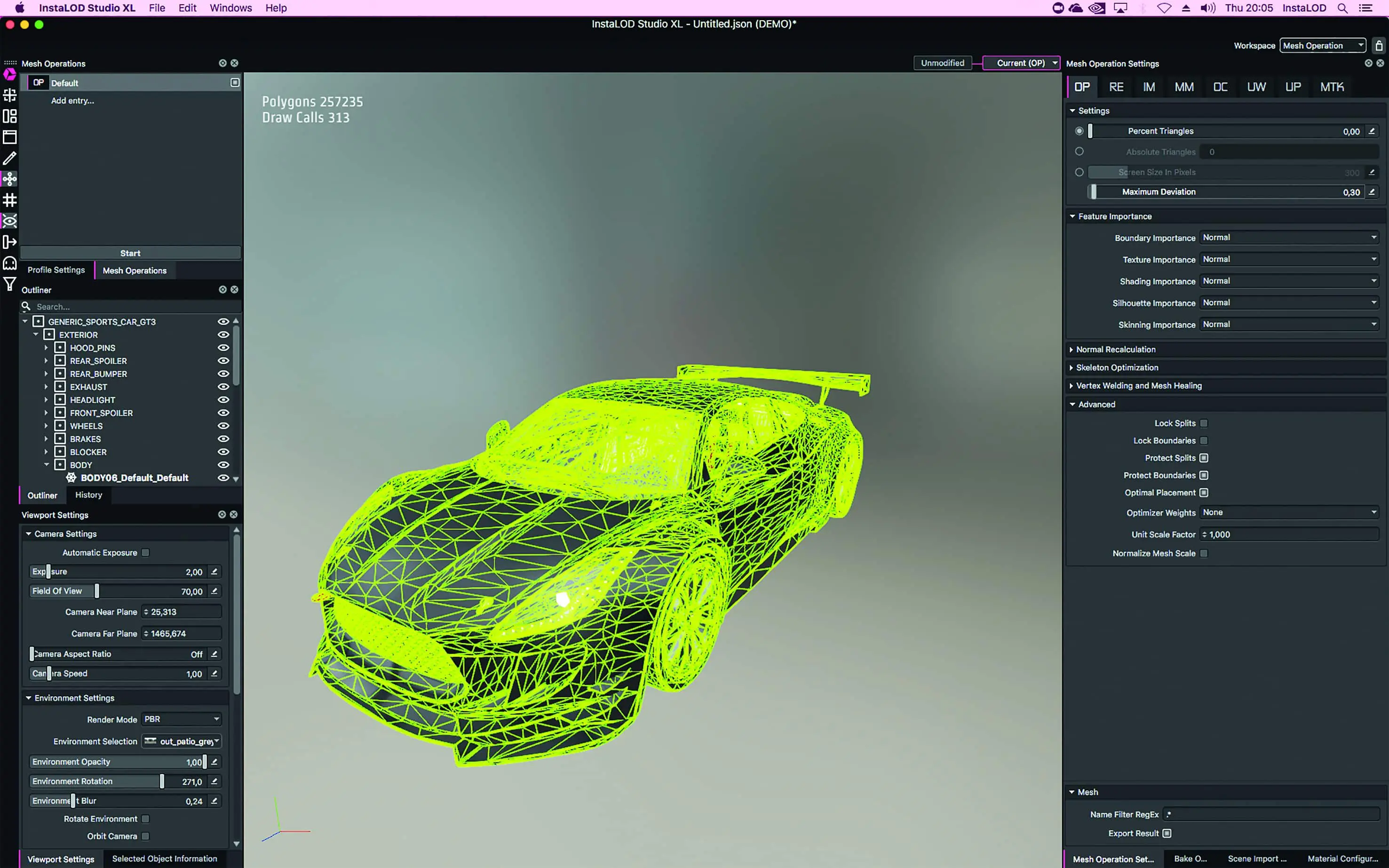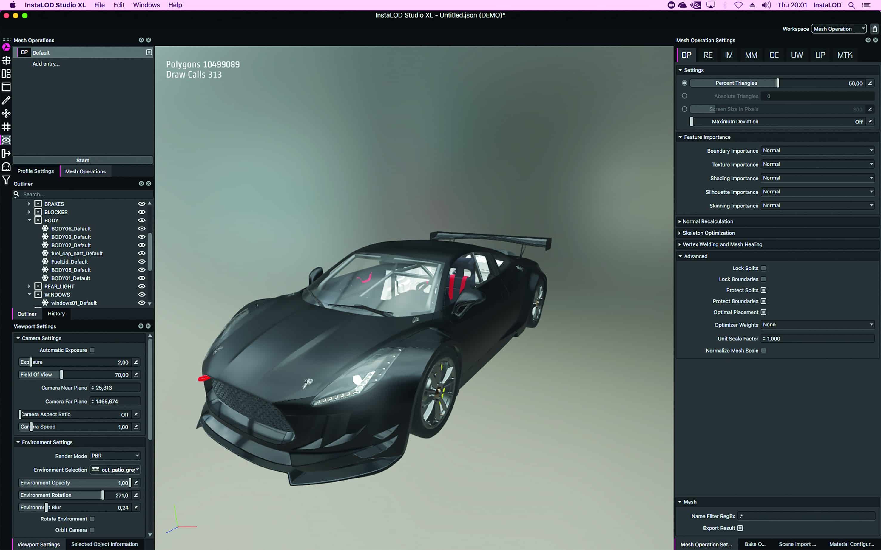 With the “Maximum Deviation” option, a threshold value can be specified that optimises up to a point at which certain changes to the mesh are reached. This allows you to automatically optimise any number of files in batch processing to a consistent quality and save different numbers of polygons per mesh as required. For example, automotive assets can often be thinned out by up to 90% of the data while maintaining the same shading.