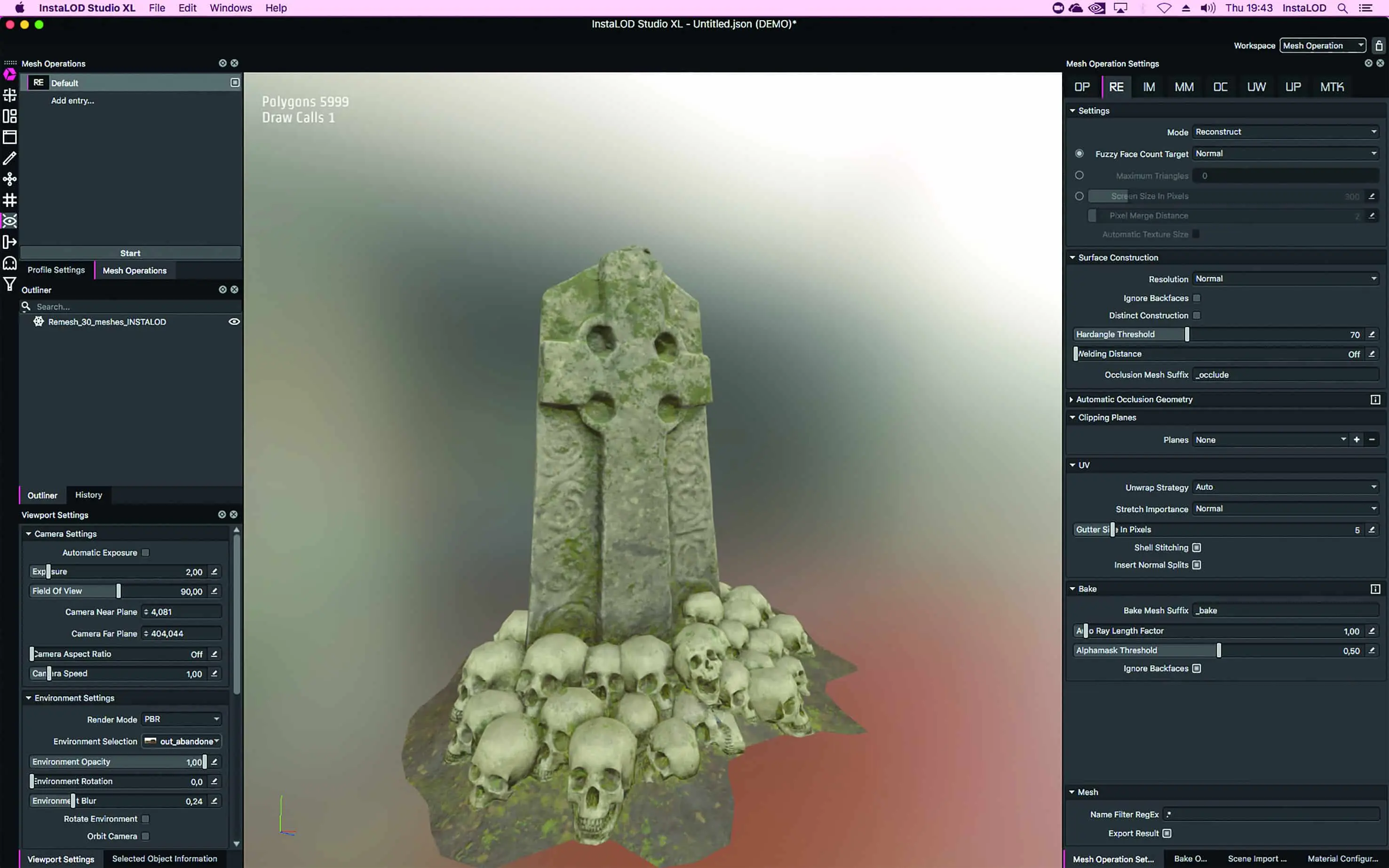 The problem with the gravestone elements shown here is that we have a scene with several million polygons, which cannot be easily transferred to a game engine. This is where InstaLOD’s Remesher can help enormously. The remesher is the perfect solution here, as it creates a single object from several objects. At the same time, we get UVs for this object and also bake all the necessary textures so that we can configure our materials quickly and easily in the next step within a texturing programme such as InstaMaterial or Substance Painter.