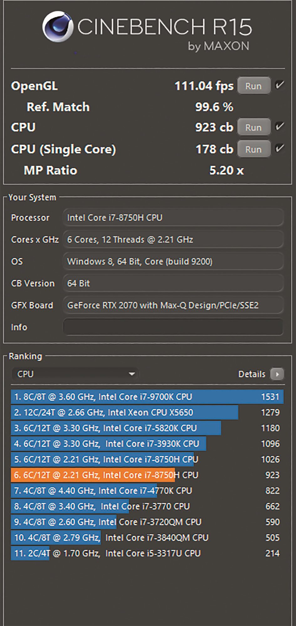 In the V-Ray render test, the i7-8750H calculated for 2 minutes and 47 seconds, while the Nvidia RTX 2070 Max-Q needed 1 minute and 37 seconds and output 15,111 frames per second in the Cinebench 15 OpenGL test.