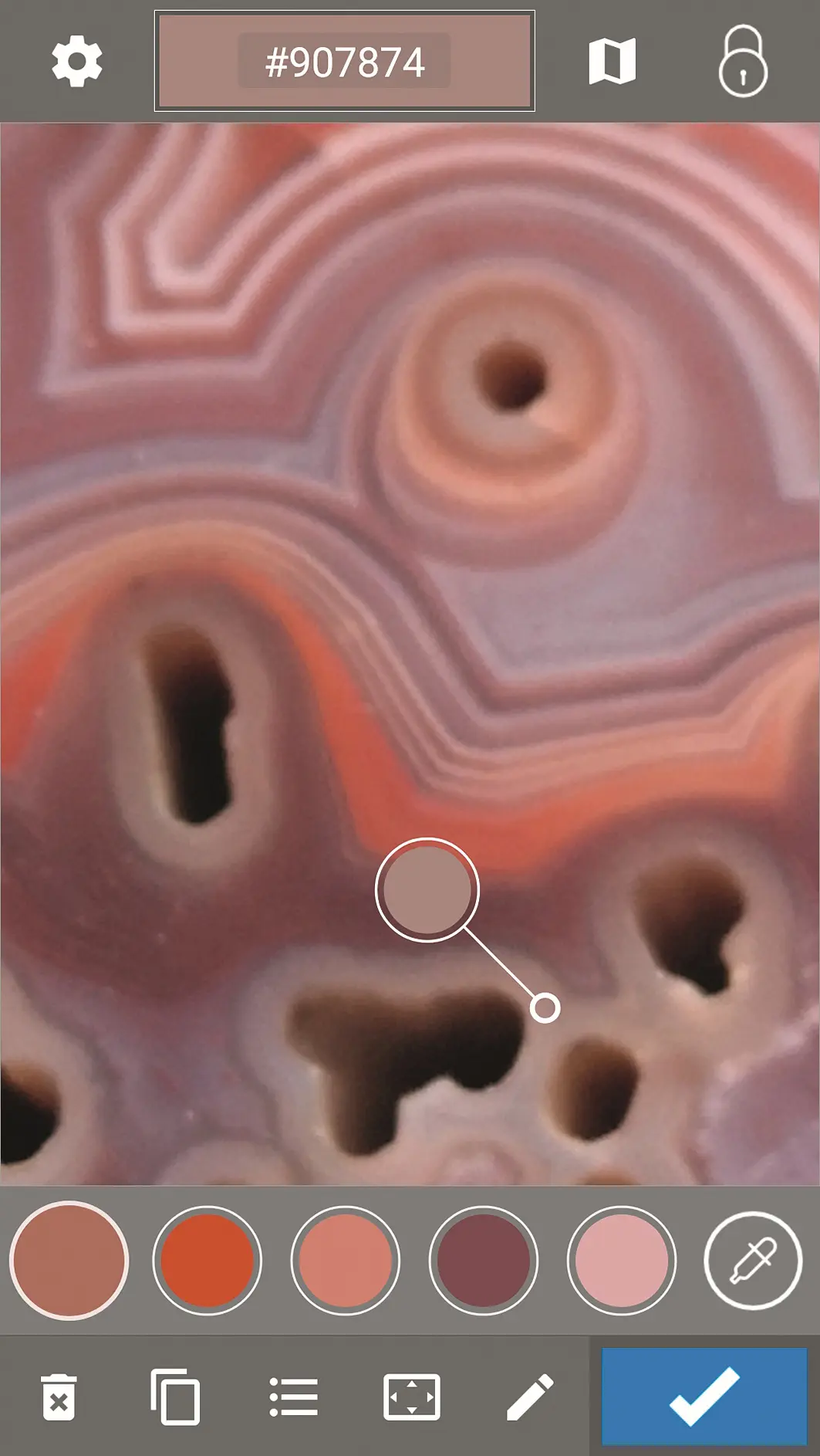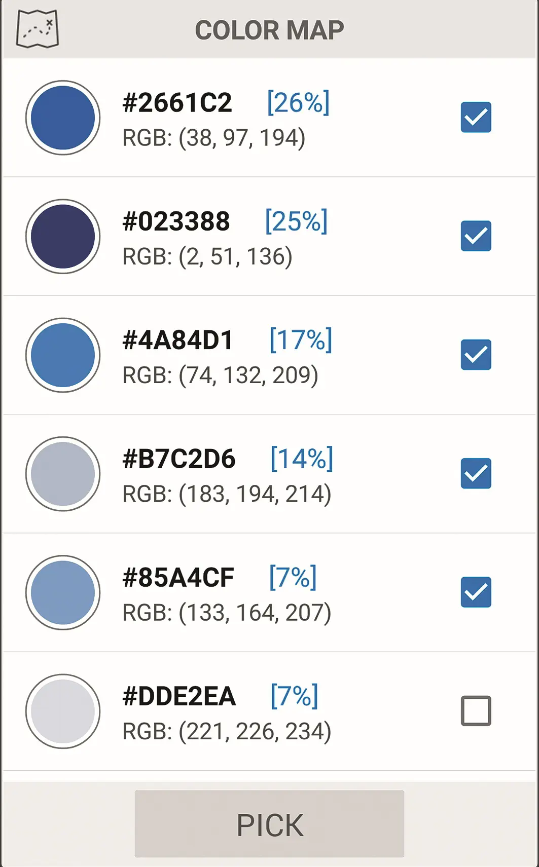 If you want to do this, you must first crop the photo in another app. The analysed colour map then shows in percentages which colours are present in the photo. You can then select which of the colours should be transferred to the palette.