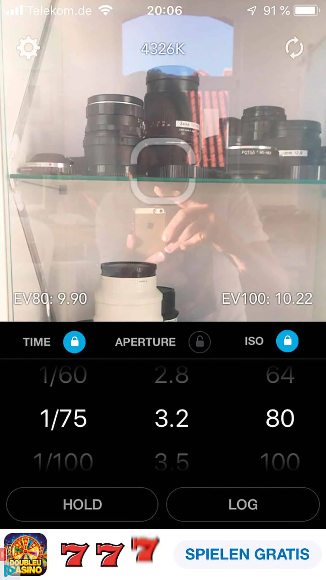 Pavel Bukhonov’s Light & Exposure Meter is ad-financed and can do much more. This app is also aimed more at photographers and is available in English and Russian. At least the values can be calibrated, albeit only in steps of 1/3 aperture and not separately for incident light with Luxi. It does not recognise film frequencies, but with 1/45 second you come very close to the standard exposure time. It can also display the colour temperature and log the values, even with thumbnail and location and time information. Unfortunately, you have to interrupt your work to upload or save the individual logs first. The often full-screen and time-controlled adverts for games interrupt your work even more and are extremely annoying if you don’t unlock the app for 5.49 euros. However, some reviews in the App Store suggest that adverts may still be displayed, which would border on fraud. An enquiry to the support address given in the store was unsuccessful, as our emails did not reach them – we therefore decided not to activate the app for testing.