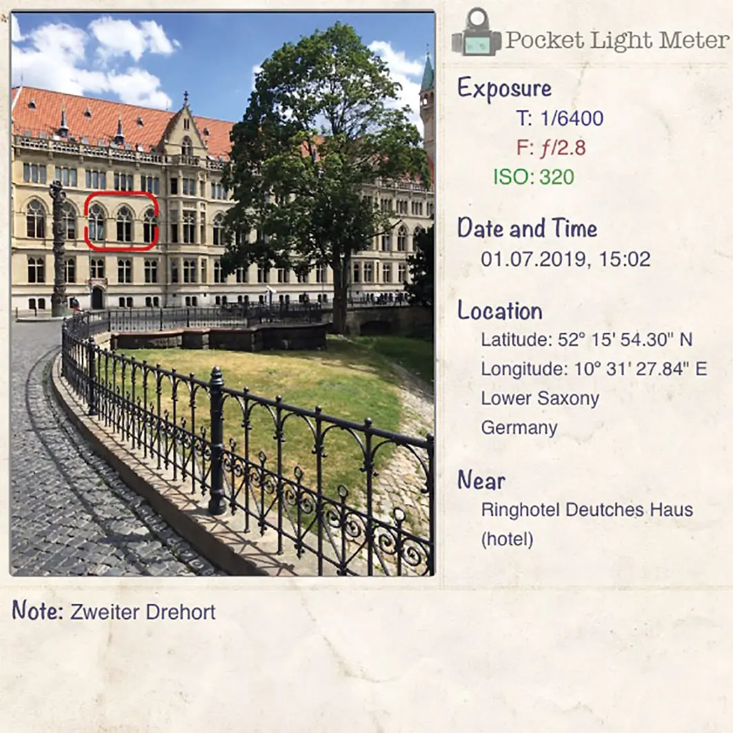 With Lightmate by Luis Laugga, the easiest to use of the free offers, fans of classic photo cameras can certainly be happy. This is especially true if the in-built light meter has already died or batteries are no longer available. It is clearly laid out, very easy to understand and is capable of spot metering. Simply tap and wait until the metering circle stops flashing. The only disadvantage: as the values are displayed directly in the image, they are more difficult to read in bright areas of the image. Calibration is not possible, so you can only determine the deviation with a reference device and, if necessary, take it into account by setting a different ISO value. Film cameramen will miss the appropriate exposure times, but here the intermediate step of 1/45 second comes quite close to 1/48 or 1/50.