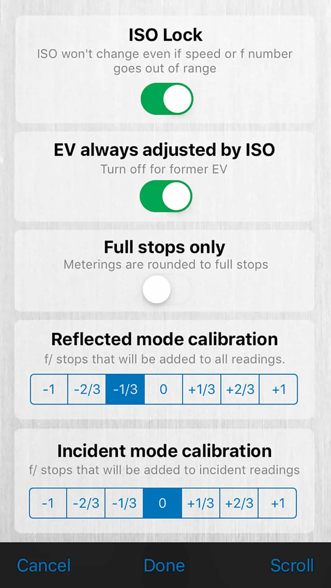 Lux – Professional Light Meter for Film Photography from Avicora allows calibration in 1/3 f-stops via the compensation value and is also quite clear and easy to use. However, contrary to what the name might suggest, it does not recognise the traditional film speed of 24 fps – this refers to analogue film in cameras. It does, however, offer 1/50th of a second or whole-numbered fractions thereof if the “Shutter Stops” setting is set to “Thirds”. This free and ad-free app is therefore also suitable for filmmakers, the only things missing are separate support for a dome, logging and the display of the colour temperature.