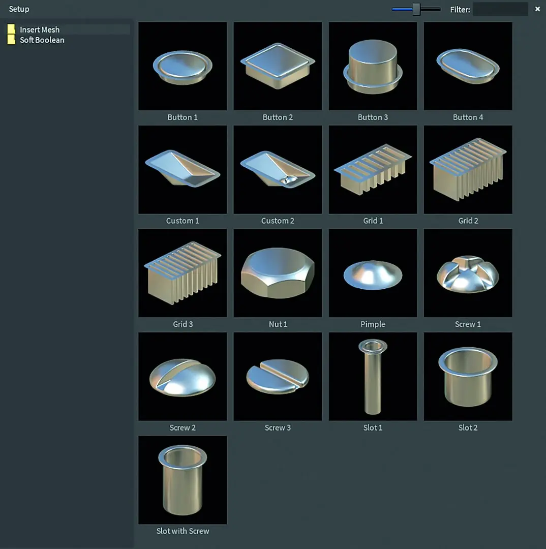 By default, the library already contains a number of objects that are optimised for subdivision surface modelling. The library can be ideally combined with the DM tool “Insert Mesh”. Areas on the source geometry can be selected to serve as an anchor for an object in the library. In short: objects from your own database are positioned at the desired locations and replace the source area in whole or in part in order to make refinements. An example of this is hard surface modelling, which is populated with additional geometry based on subdivision surface modelling principles in order to attach rivets and complex screws to metallic surfaces.