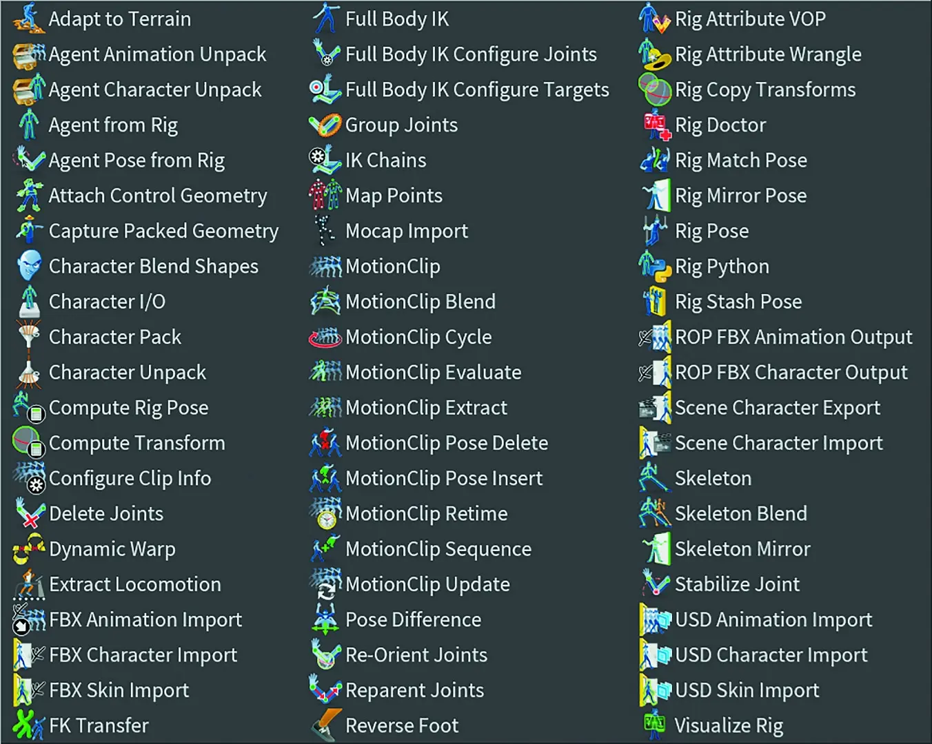 The tool and workflow includes over 60 new nodes. The bones and joints are now normal Houdini Geometry. This has the great advantage that all other tools can now modify the skeleton, and conversely the KineFX tools can also be used for other modelling or animation tasks. It’s not just about characters here, machines or other things like plants can also be edited with the tools. The whole thing is already very extensive, but is only the beginning of a full character animation pipeline that SideFX has announced.
