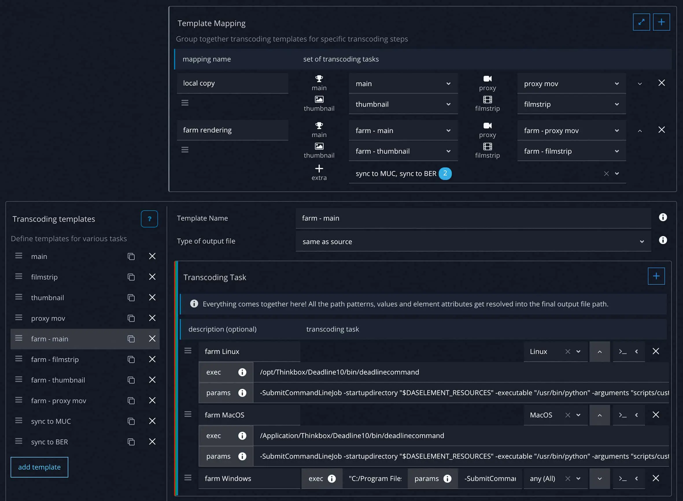 Existing in-house scripts can be used by running a custom command as a transcoding task. This means that you can also send everything to the render farm as a nuke job. The software offers various example scripts and you can download the latest version from a Git repository.