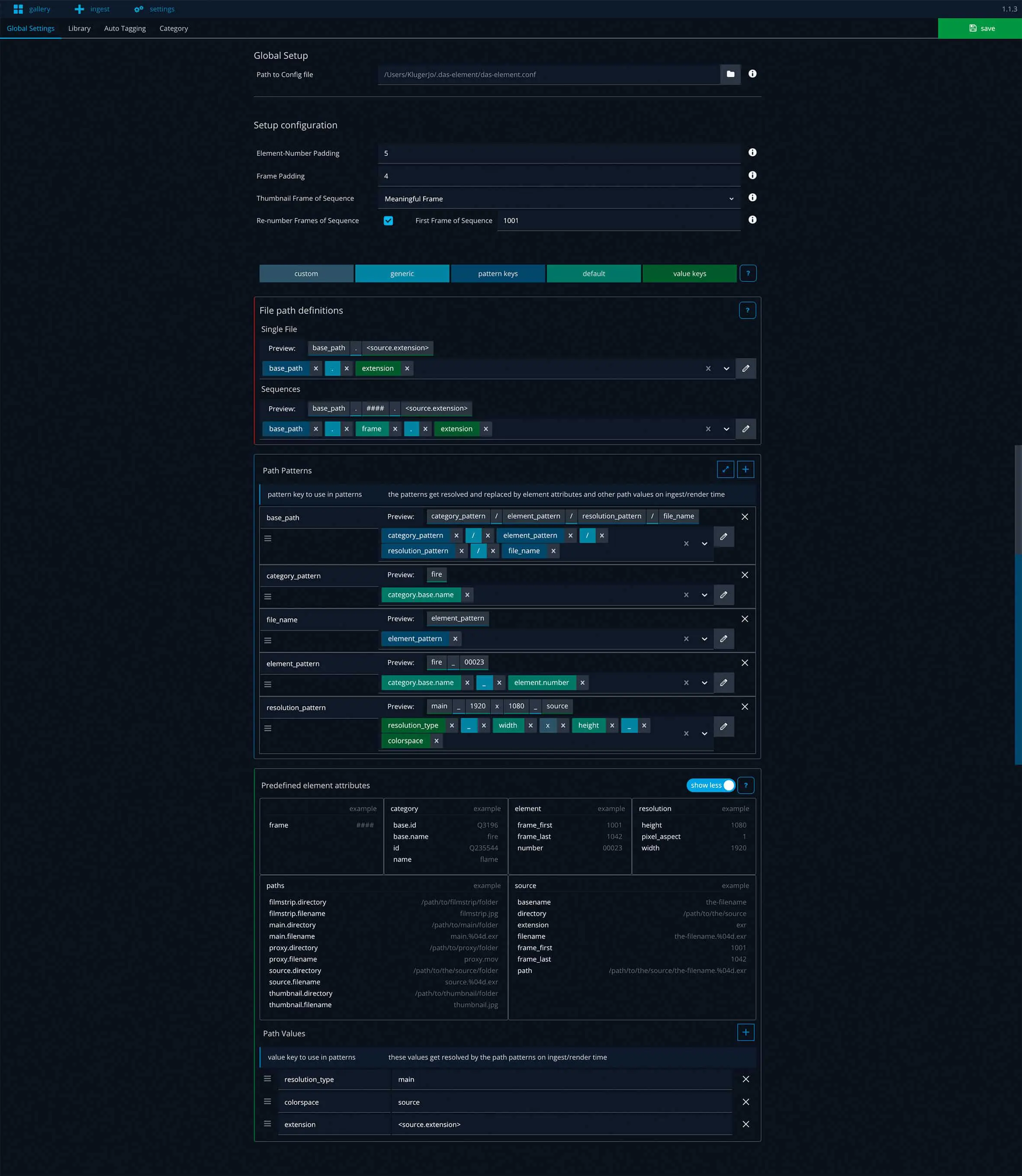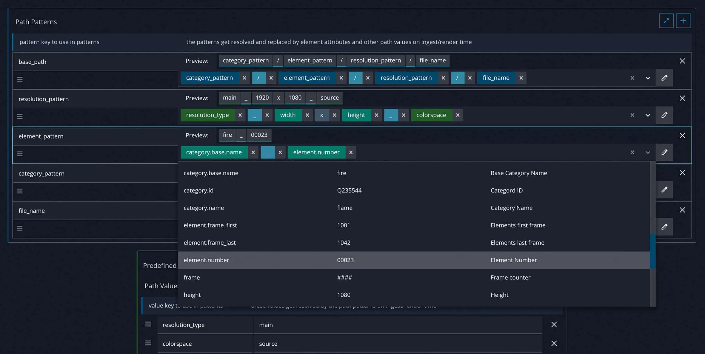The third type, wildcards, are placeholders for parameters that are dependent on the individual elements. The software analyses each element carefully before it is entered. Values such as the resolution or file format, the first and last frame for image sequences and the codec or frame rate for videos are entered. These are also values that can be used to describe the element.