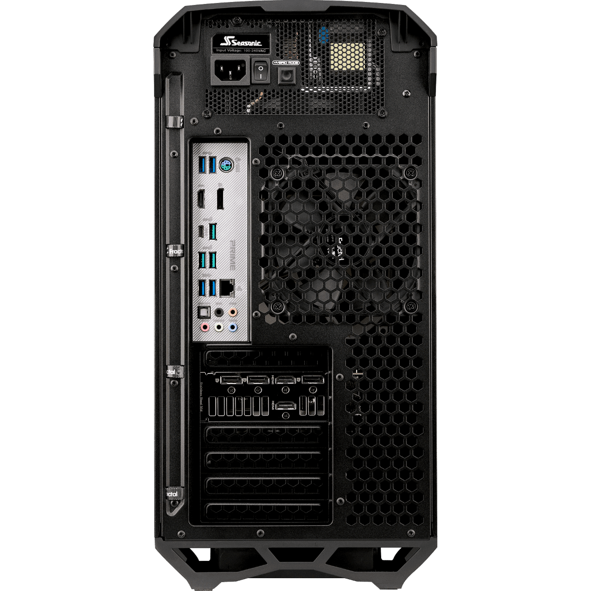 At the rear, the Asus Prime Z690-P D4 motherboard offers two USB 2.0 ports (Type-A), one USB 3.2 Gen 2 port (Type-A), one USB 3.2 Gen 2×2 Type-C port, two USB 3.2 Gen 1 ports (Type-A), one Realtek 2.5Gb Ethernet port, one optical S/PDIF output, five audio jacks, as well as one HDMI port and one DisplayPort, neither of which we need because of the RTX 3090 at the centre of the workstation.