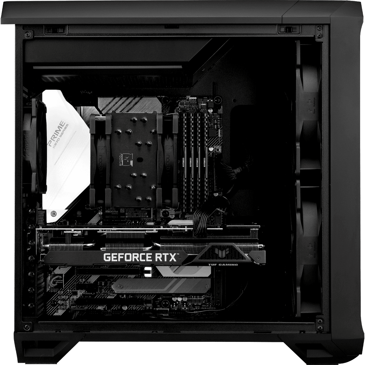 Inside, in addition to the aforementioned mainboard and graphics card, an Intel Core i9-12900 processor, which is kept at the right temperature by a Noctua NH-U12A CPU cooler, and two 32 GB DDR4-3200 Corsair Vengeance LPXs provide the thinking power. The power supply is regulated by an 850 Watt Seasonic Focus Plus power supply unit. The supplied system was rounded off with a 1 TB M.2 Samsung 980 PRO and a 2 TB M.2 Samsung 980 PRO as well as an 8 TB Seagate Ironwolf Pro HDD with 7,200 rpm, which was hidden in the upper area under the top cover. All in all, this sounds like a really good combination on paper