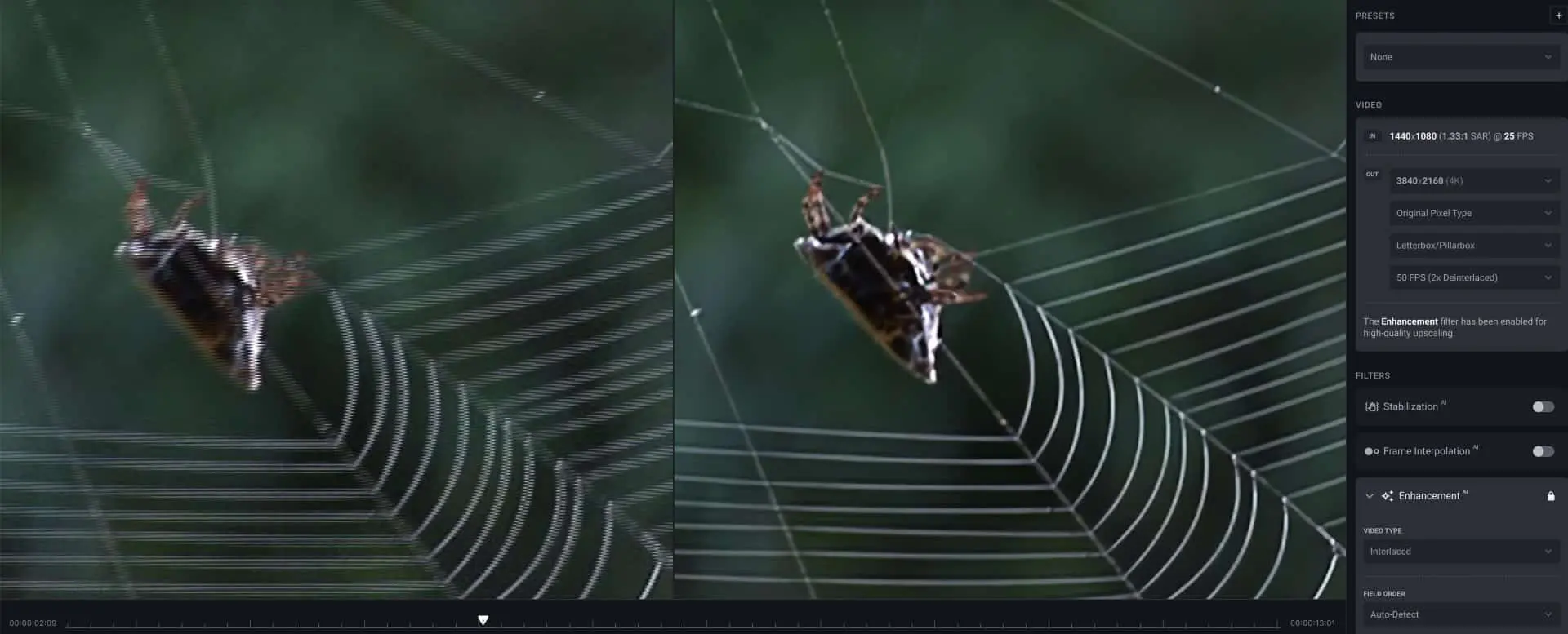 For comparison, we ran the material through the ‘neural’ de-interlacer in DaVinci Resolve Studio (DR for short) and upscaled it with its SuperScale. While differences in the scaling