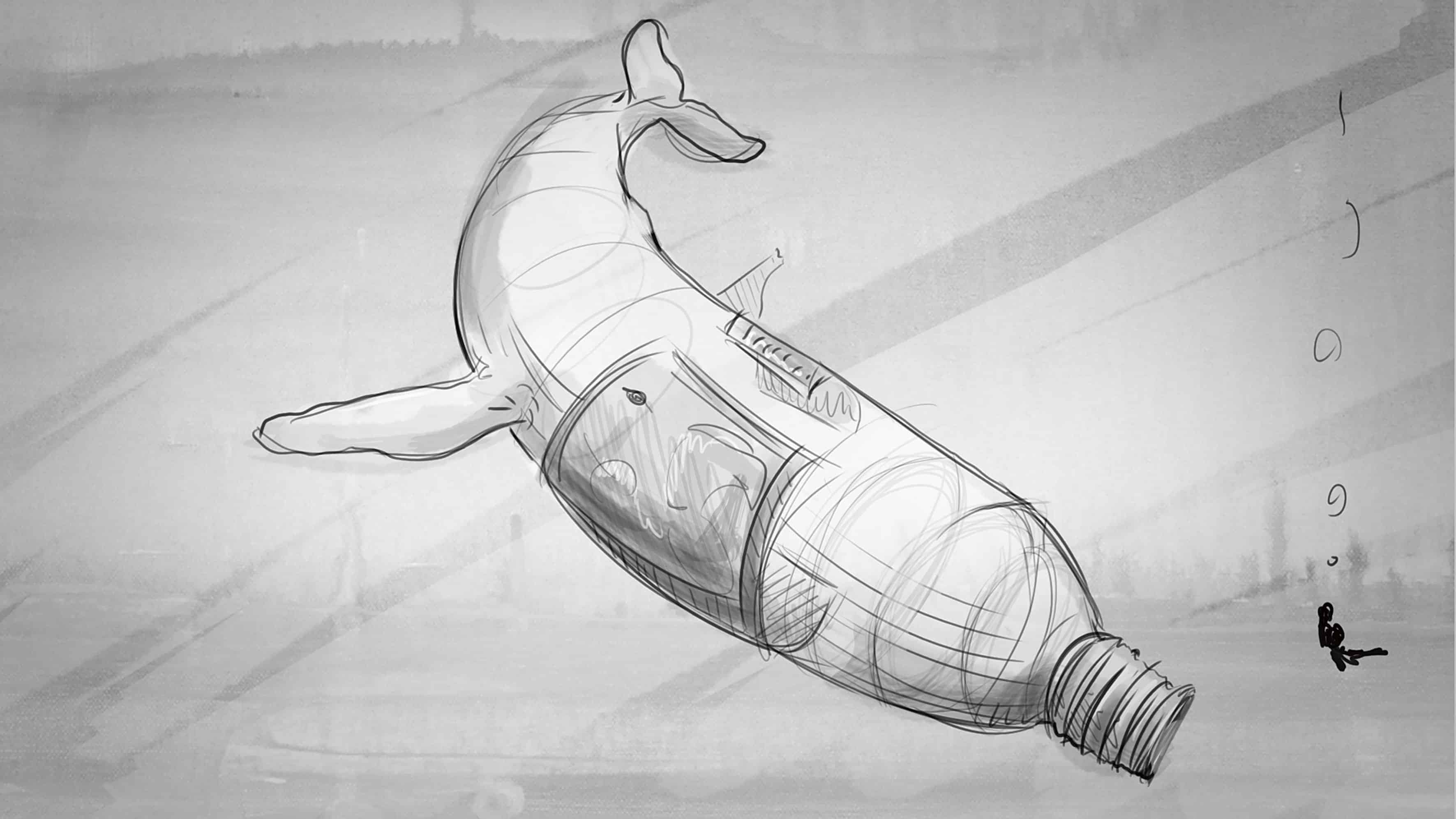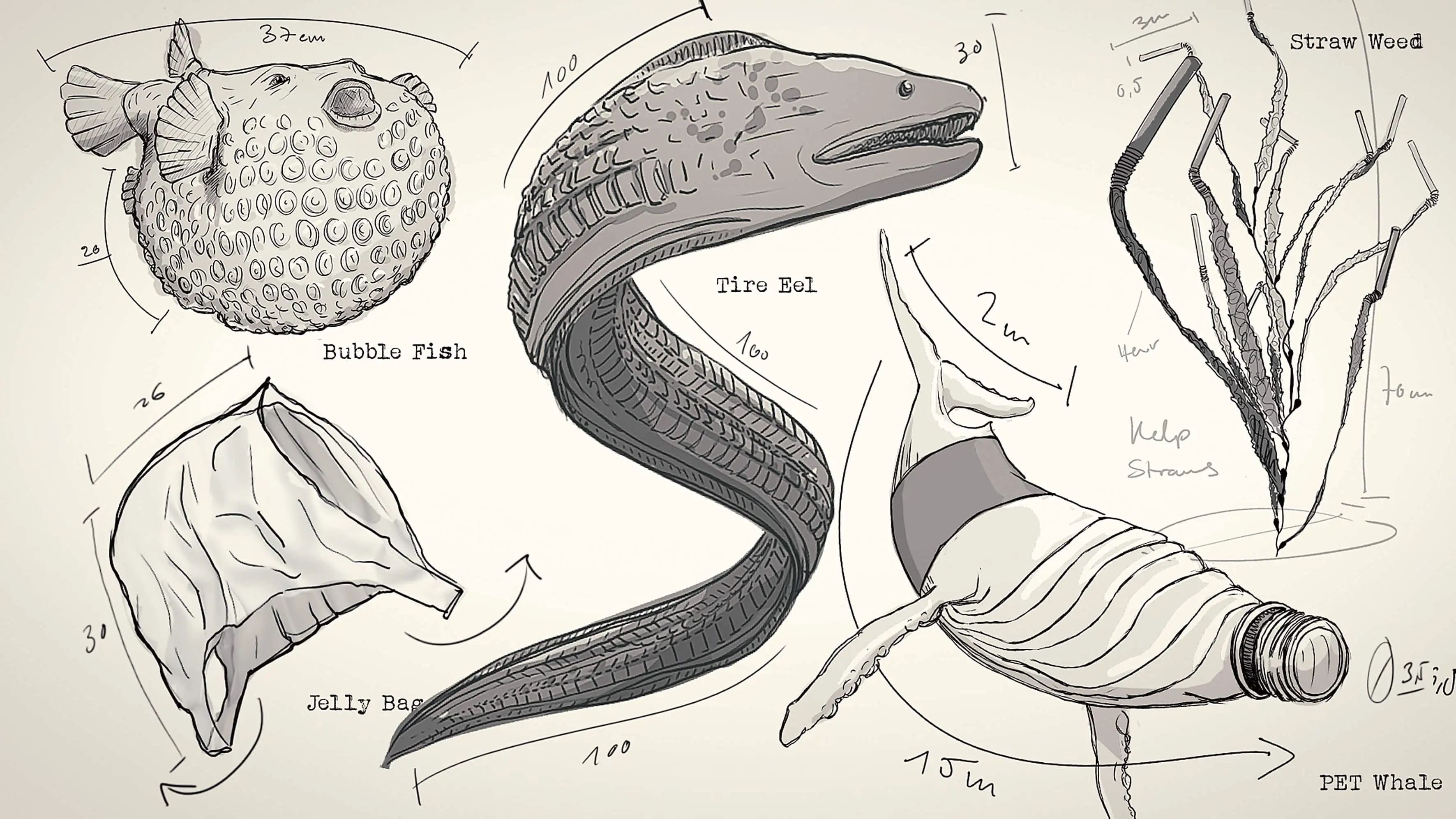 Pascal Schelbli: I can’t give you an exact number, but there were definitely a few rounds. It all started with a picture of a ray with a flip-flop flap on its back. Then came the moray eel, which was finalised very quickly. With the whale I had tried different types of bottles, with the bag the decision was with or without tentacles, the pufferfish almost ended up being a detergent container and the straw was first given a seahorse fin.