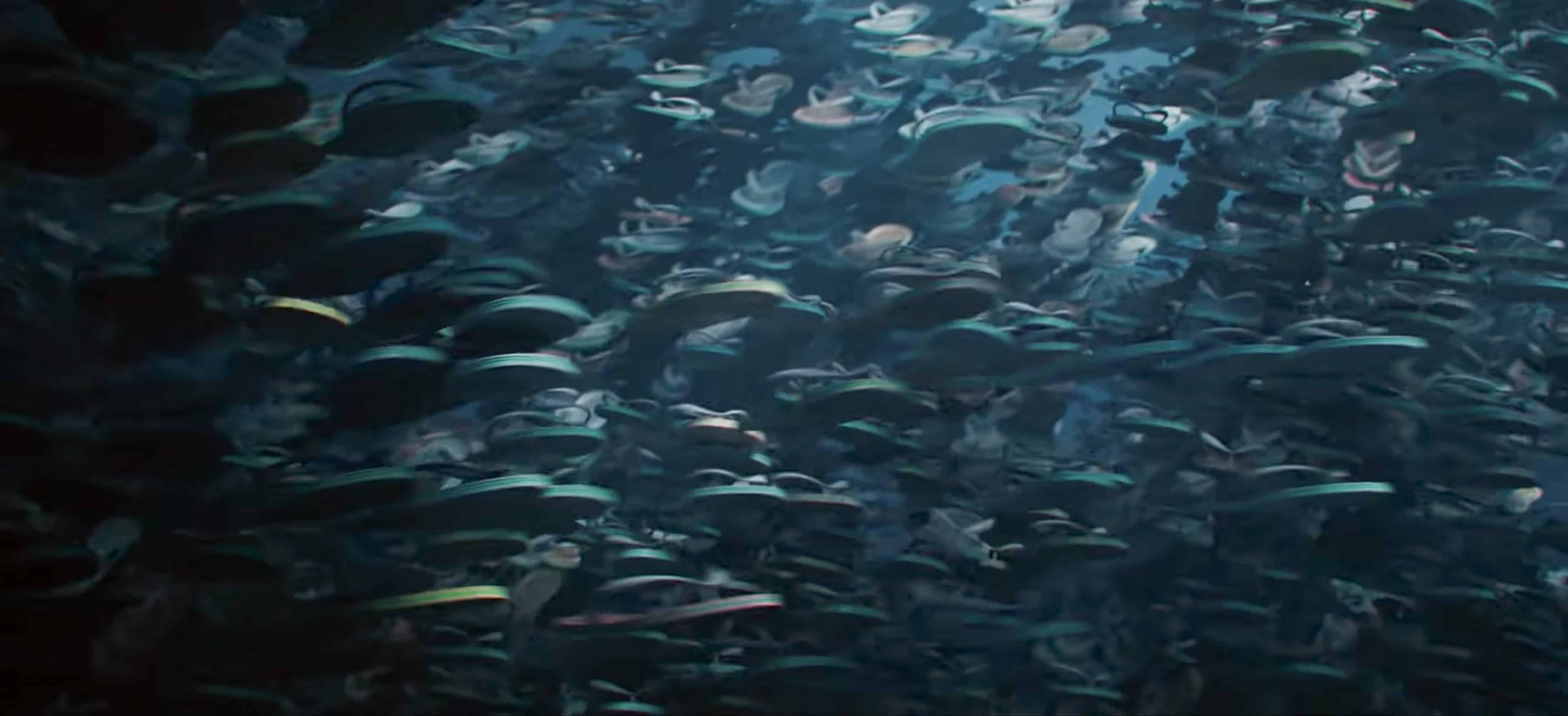 Lukas Gotkowski: The flip-flop swarms were created in Houdini. We created point clouds in 3D space and used vector fields to move and align them. These fields were generated in such a way that they depict the movement patterns of a school of fish. The movement of the particles could be customised with additional parameters to change the speed or size of the individual small shoals. In this way, we were able to manipulate the movements not only realistically, but also with artistic control. After creating the simulation, several models of the flip-flops were attached to the particles to transfer the position and orientation of the particles. In addition, further variables that were helpful for shading – e.g. size and colouring – were distributed to the points. The data was output using the Arnold exporter (*.ass files) so that it could be prepared as flexibly as possible for Arnold in any software package.