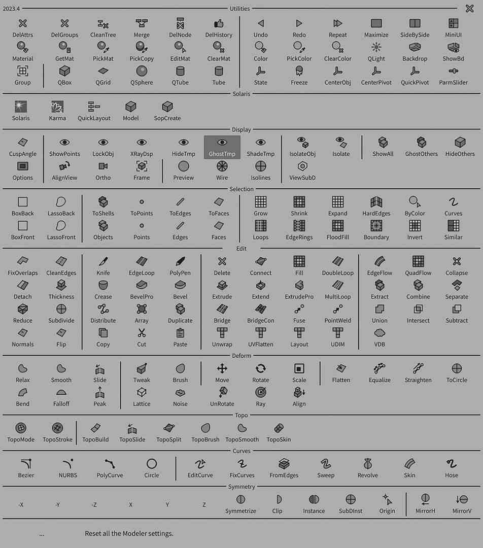 Modeler is activated via the shelf tool of the same name. A yellow line in the viewport shows that Houdini is now running in Modeler mode (and some vanilla shortcuts will now be used by Modeler elsewhere). Let’s take a closer look at the launcher and the most important tools. Viewport with Alt-B in fullscreen mode and off you go!