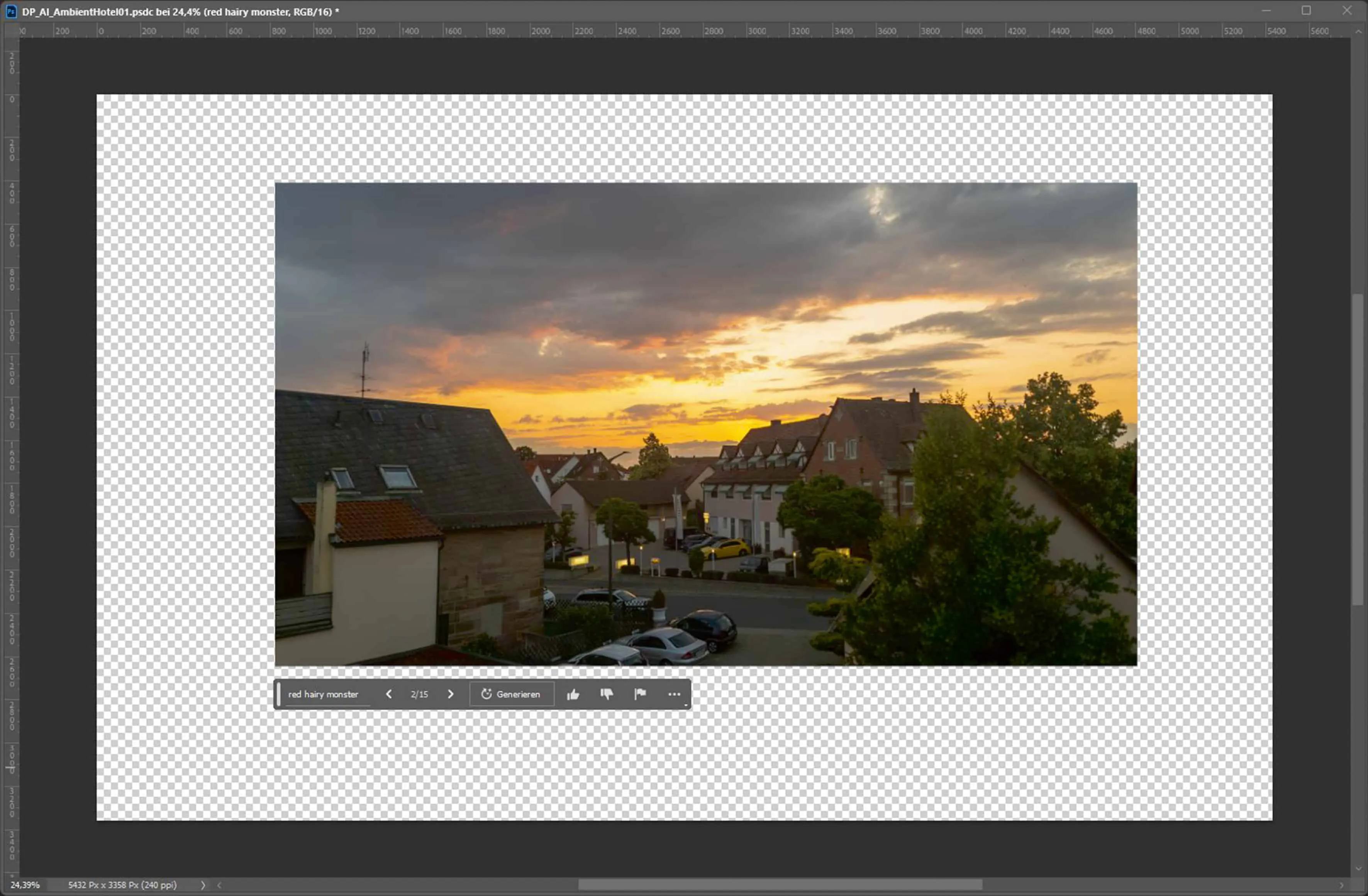 To do this, I first removed the hotel logos and the parked cars from a sunset snapshot from the hotel window. Surprisingly, this works better when the selection extends a little beyond the objects. After a few attempts, the vehicles were removed using suitable overlays. The AI also generated the slightly larger, clunky car at the front.