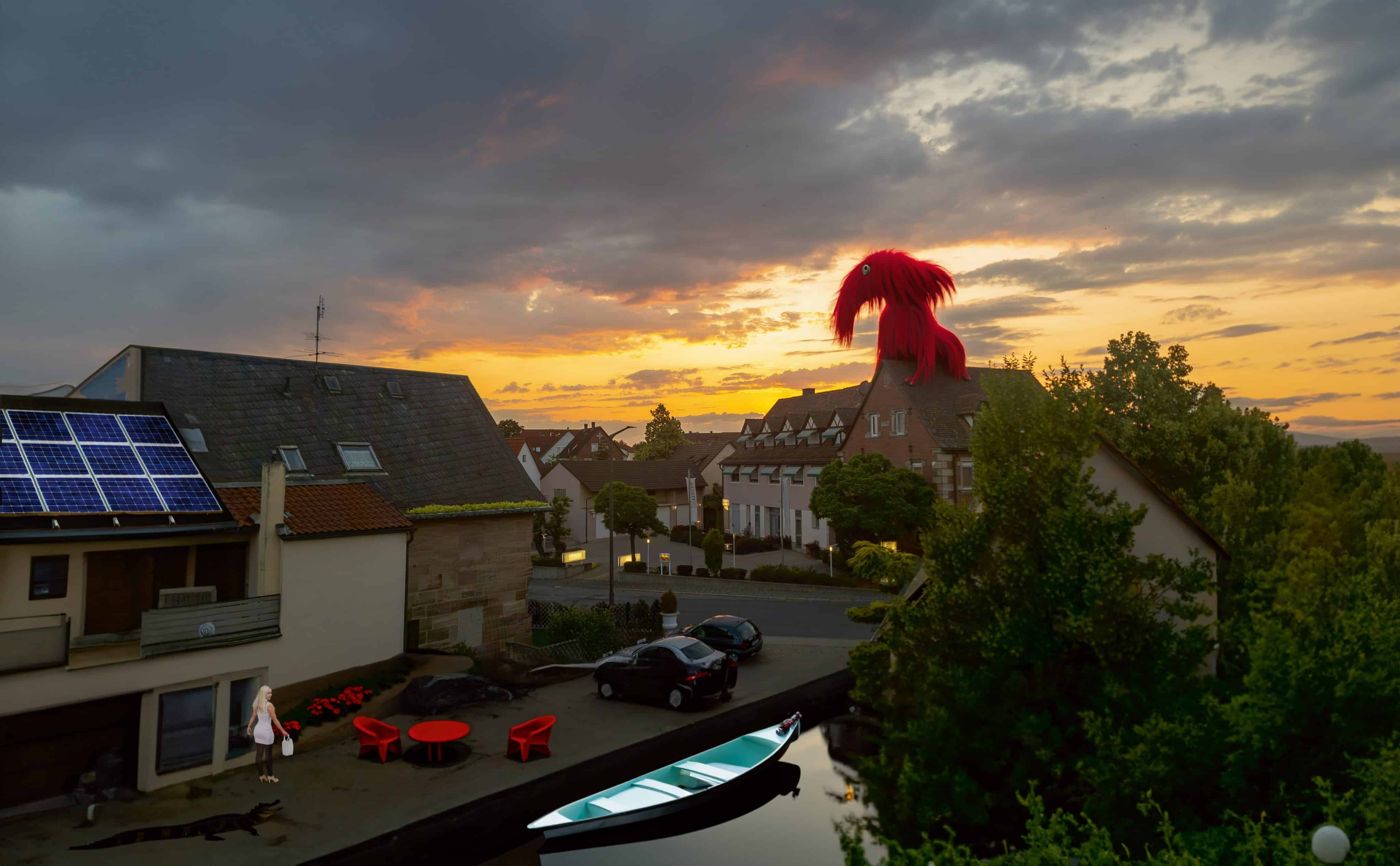 My favourite object, however, is the “red hairy monster” on the roof. Three versions are created for each generation and if they don’t fit, three new ones are created. You can also adjust the prompt a little each time and hope that it will eventually match what you had in mind. However, there are no guarantees. But as long as that’s the case, we creatives don’t need to worry too much about the AI taking our jobs, because it’s not possible to implement concrete specifications for real customer orders in this way. However, AI can be very helpful in finding ideas. Even the sometimes very strange excesses.