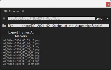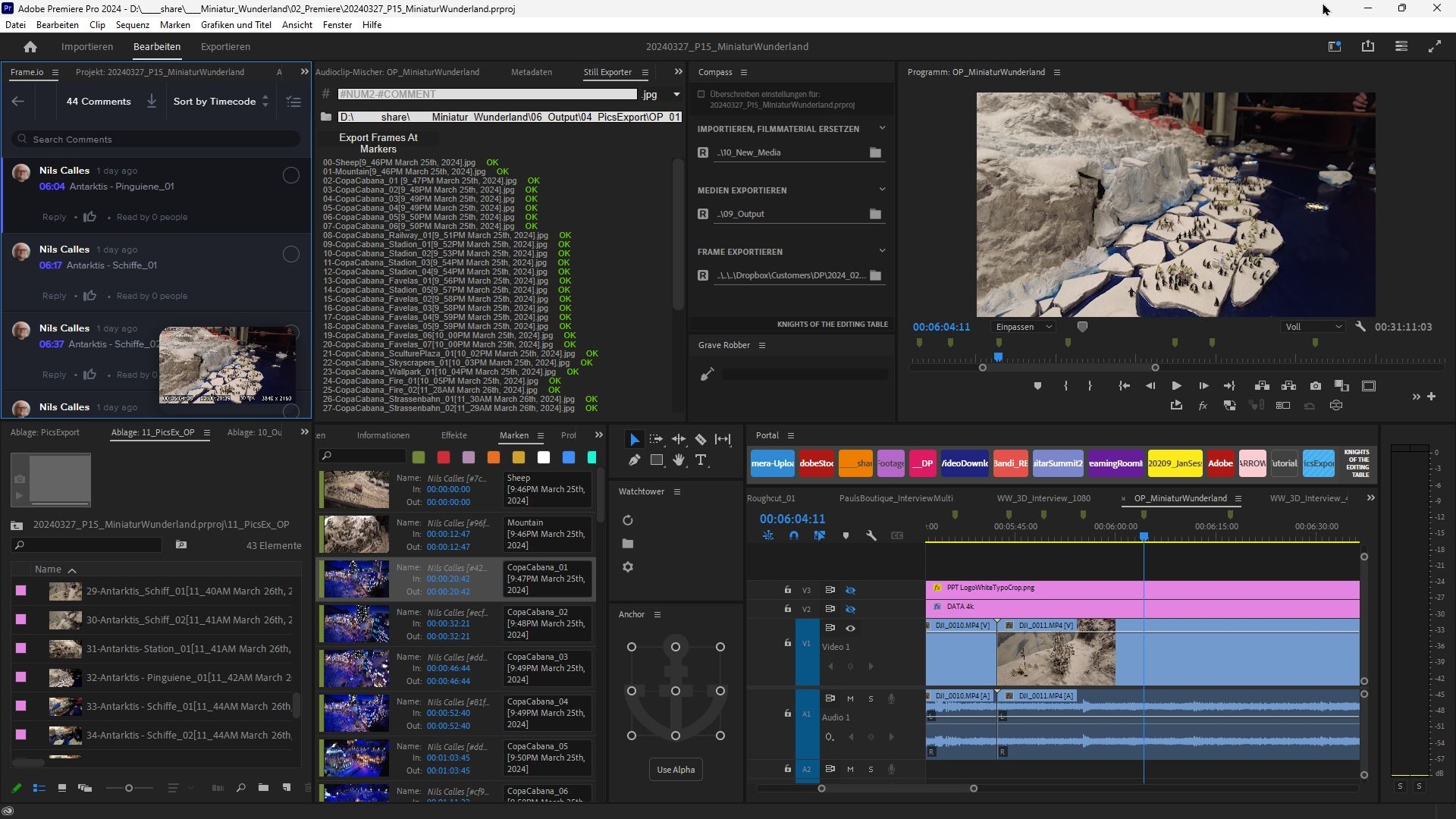 All too often my customers want stills from the films I produce for their website. Of course you can put the still frame export on a keyboard shortcut, but the save dialogue alone takes a lot of time. Wouldn’t it be practical if you could simply export a frame automatically at each marker, where you can also specify the storage location and the name? I contacted Michael Möhl from Mamoworld with this idea, who actually liked it so much that he realised it. You select a sequence. If you have also uploaded the sequence to frame.io, the customer can select images for export using comment tags. These can then be imported into the Premiere sequence. When naming the files, which is opened by clicking on the #, there are lots of options. You can integrate numbering, timecode, name and comment. This also helps with finding and indexing the images. The names are then displayed in a preview. The images are exported as shown in the programme monitor. This also includes effects and overlays. This means that they can also be exported with watermarks, subtitles or timecode burn-in without any problems. PNG, TIF (also with alpha channel), JPG and DPX are available as export formats. The export size depends on the image size of the sequence. A similar function is also available in Excalibur. However, there are no naming options here. The images are automatically numbered and labelled with the sequence name and timecode. In this example, the annotated markers were imported from frame.io and then the frames were exported using the Mamoworld Still Exporter. As you can set the exact type of naming there, the comments are included in the file names. Unfortunately, frame.io always includes the date in the comments. However, this could have been deleted manually from the marker lists before the export in order to have only the remarks. If the export had been made with Excalibur, the file names would contain the sequence name and the time code, which in this case looked like this: OP_MiniaturWunderland_00-06-17-11.jpg