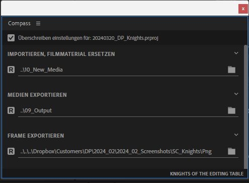 Unfortunately, the Premiere export always goes to the last selected folder, regardless of the project. This is annoying, especially if you often switch between projects. With Compass, the output locations can be selected on a project-specific basis. This is done separately for media and frame export, as well as for import.