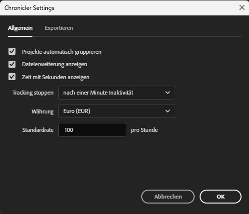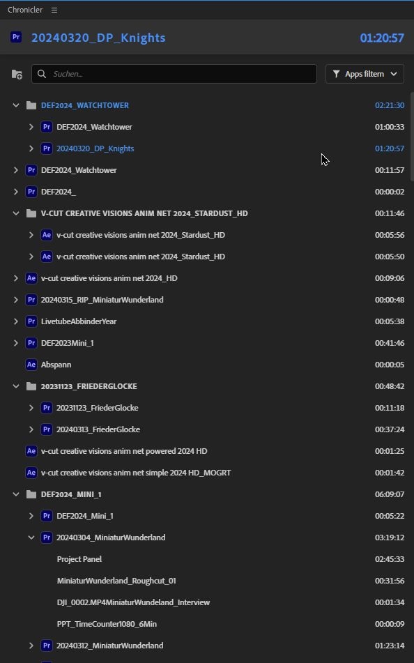 After installation, you open this tool, like all extensions, via the Window – Extensions menu in Premiere and After Effects. All Adobe-specific projects are then logged there in detail. This even includes how long you have been working in a specific timeline in Premiere or in a composition in After Effects. This also applies to Smart Objects in Photoshop, Links in Illustrator or Scenes in Animate. Projects can be organised in folders for a better overview. There is also a search and filter function. The billing function allows you to determine what you can charge the customer. The hourly price and the currency can be set in the settings. The idle time can be used to set the period of inactivity after which the time recording stops so that no idle times are counted. The time recording can be exported as a CSV file so that it can be imported into Excel, for example. And it can probably also be displayed on a website.