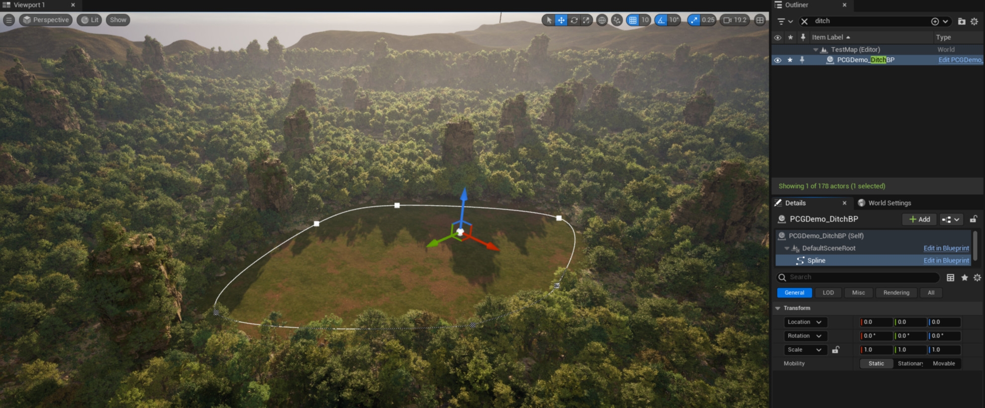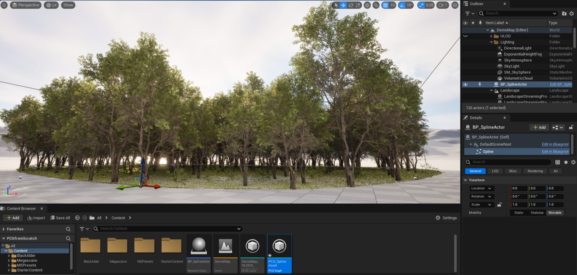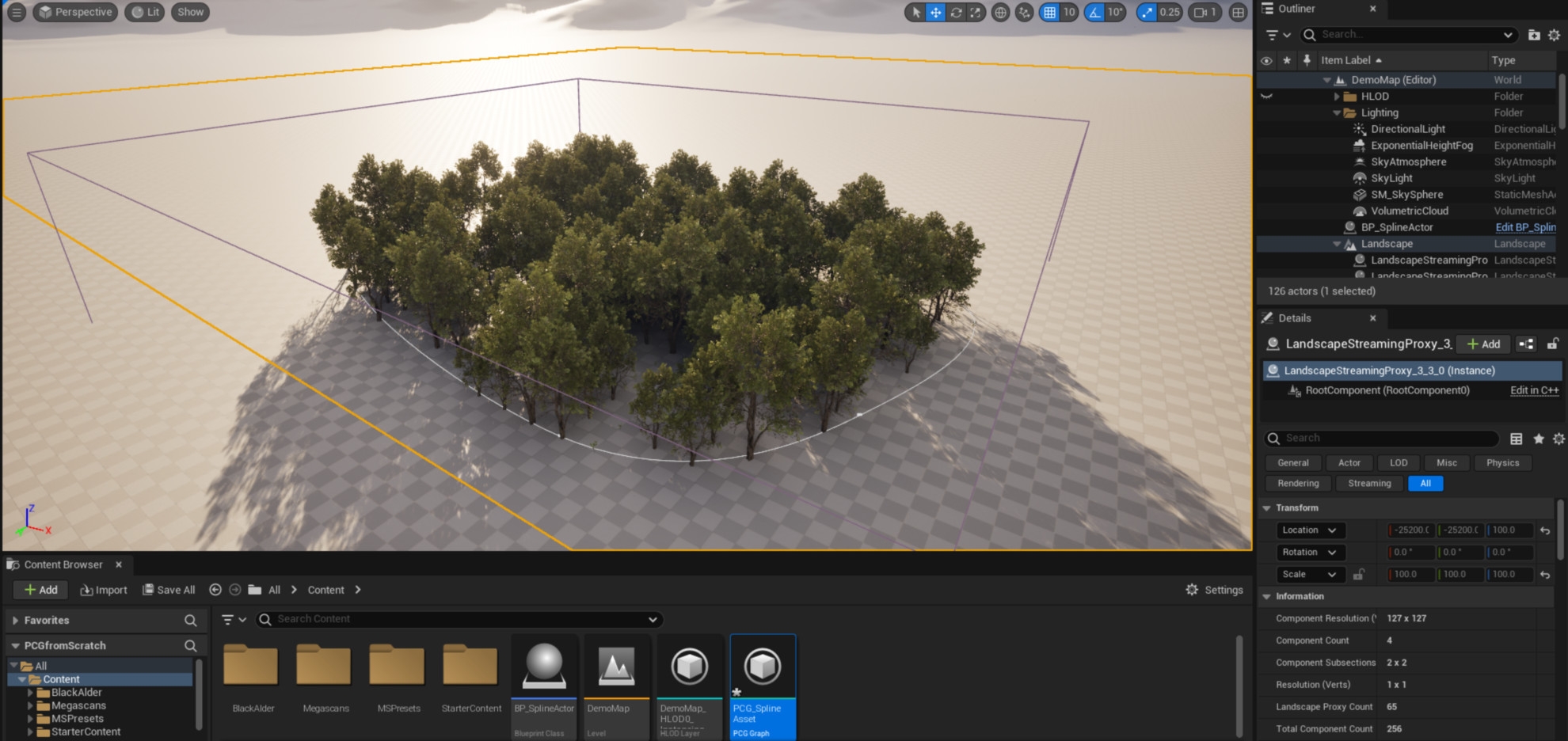 The easiest way to get a quick “aha” experience for the practical application is to start with a fresh scene and try out a typical use case, e.g. a landscape with a building surrounded by dense forest. So, create a new modular map within the Electric Dreams project via File, add landscape material to all landscape tiles and place the Blueprint Actor in the scene via the Content Browser. All the magic now unfolds when you activate the Generate button in the Details panel of the PCG section. As expected, the terrain is now populated with the forest assets and you are free to make one or two adjustments. To generate a recess for the building, another Blueprint Actor is required, which can also be found in the Content Browser: The Actor. Placed in the desired area, it now has a spline curve in the detail window, which can be used to precisely determine the recess boundary to the forest growth.