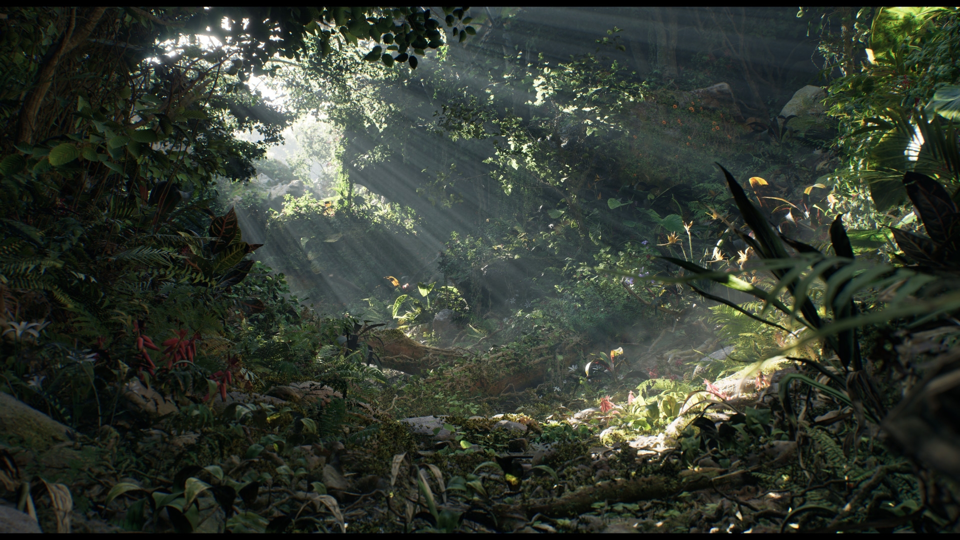It goes without saying that you’ll need a computer with a sporty set-up, as the wild undergrowth with dense undergrowth on a huge terrain is a real challenge. Nevertheless, the jungle madness is made up of surprisingly manageable asset building blocks, as relatively few, but dynamic Quixel asset packages are sufficient to populate the green hell.