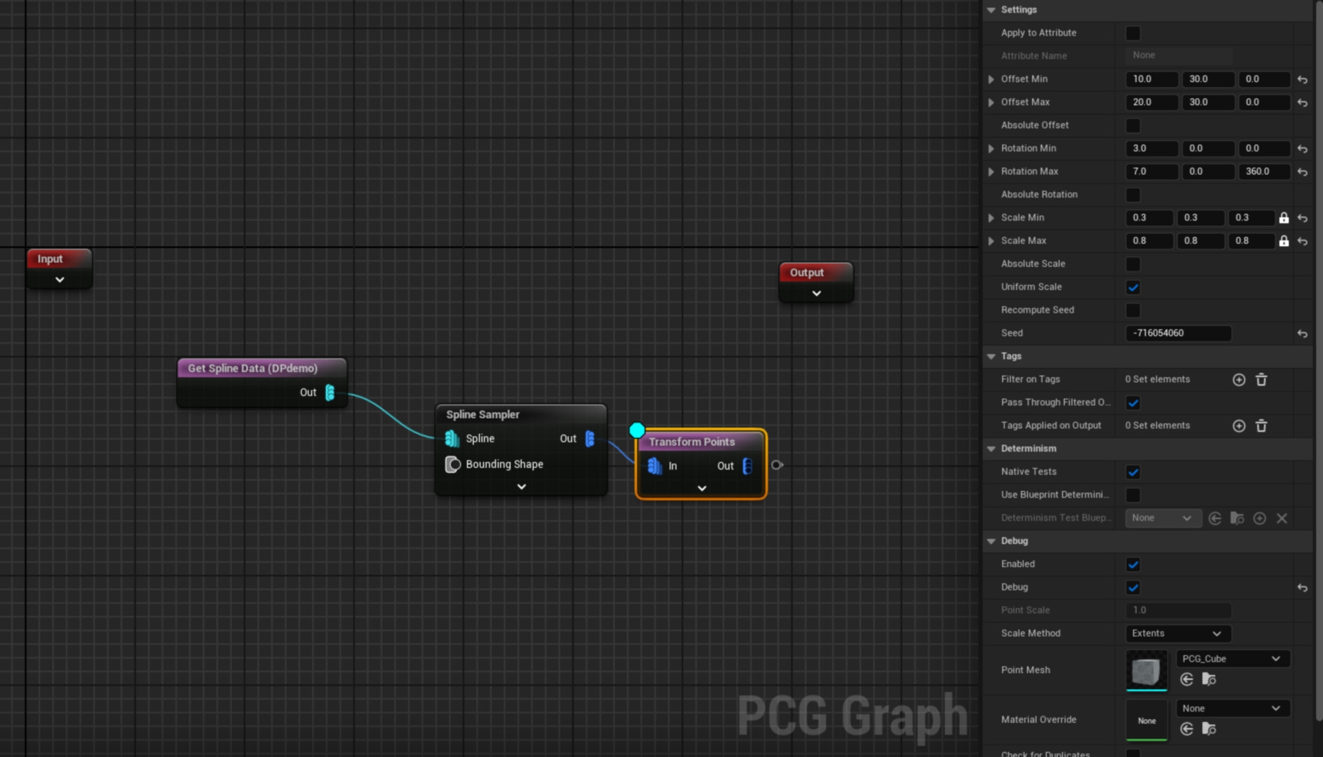 Fortunately, you can use a debug function with keyboard shortcut d to call up the debug visualisation for each node in the PCG graph and use shortcut e to temporarily deactivate the individual nodes. This helps enormously when using the rough debug point view to analyse exactly where the points fall so that you can quickly make improvements without having to generate the entire landscape every time.