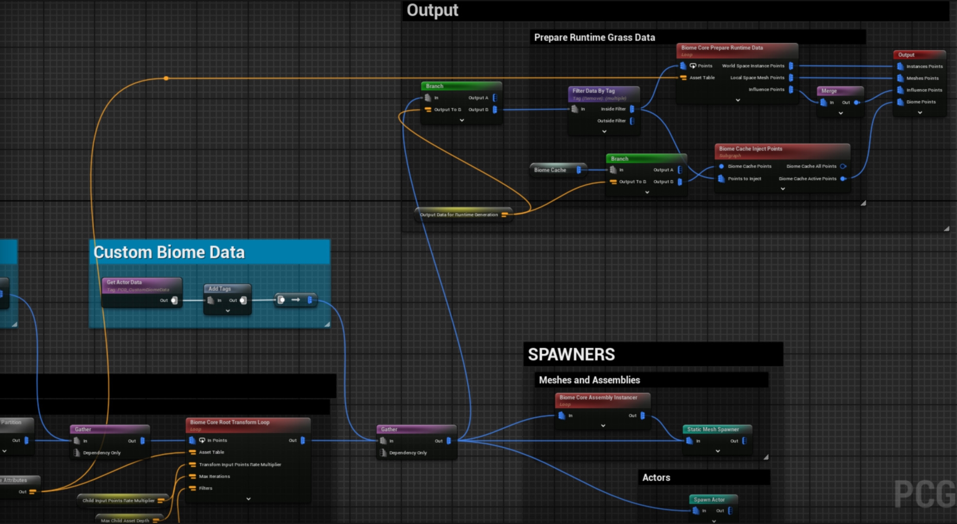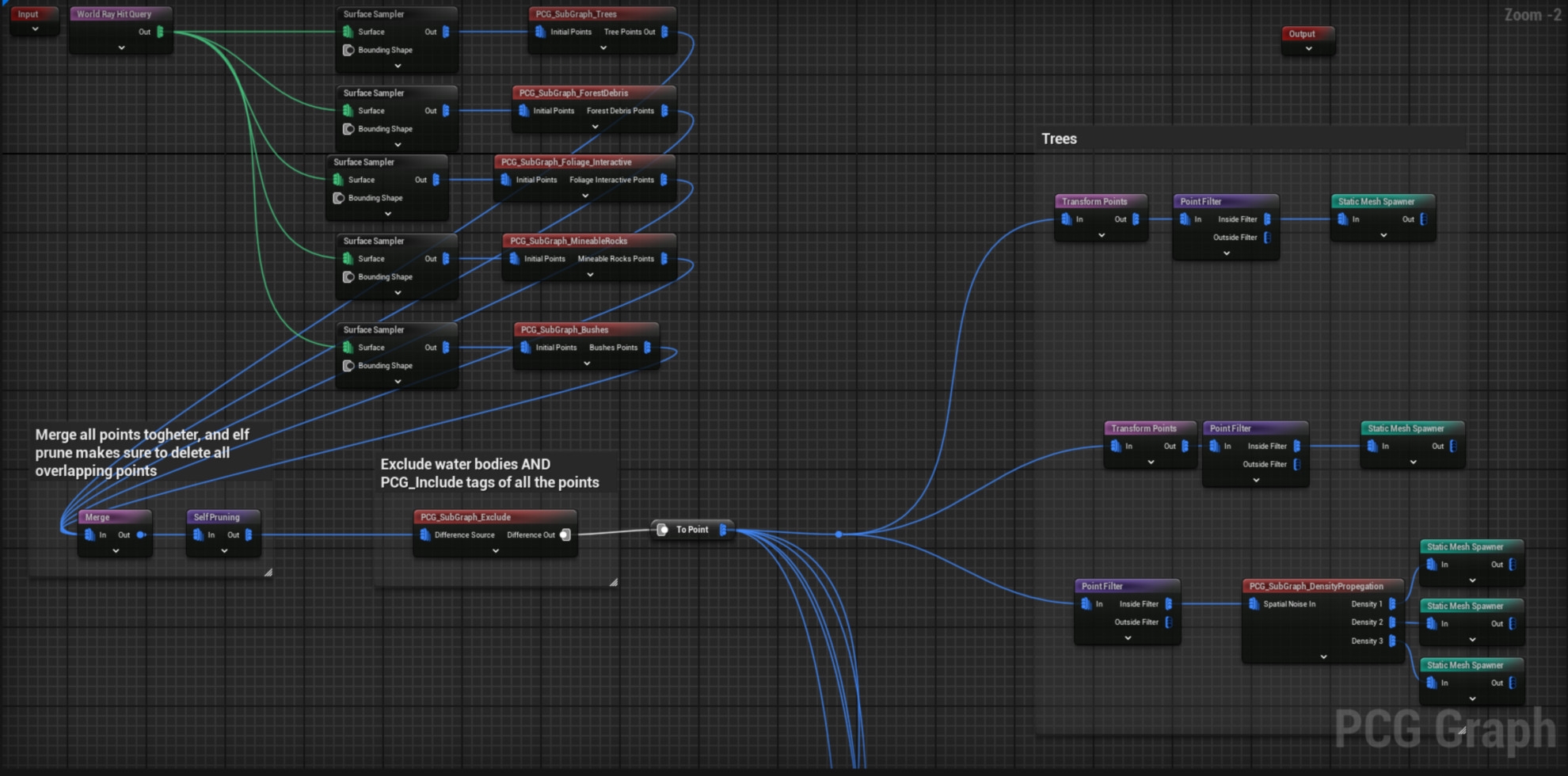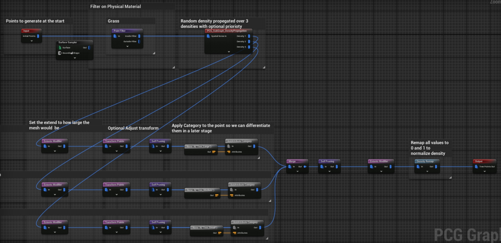 There are various ways of generating and distributing the various landscape elements such as trees, bushes and tufts of grass, etc. For example, you can use filter functions to filter out points for generation, organise PCG graphs in a nested manner via subgraphs, or simply create new offshoots in the PCG graph, each of which then has its own functions and generates additional mesh types.