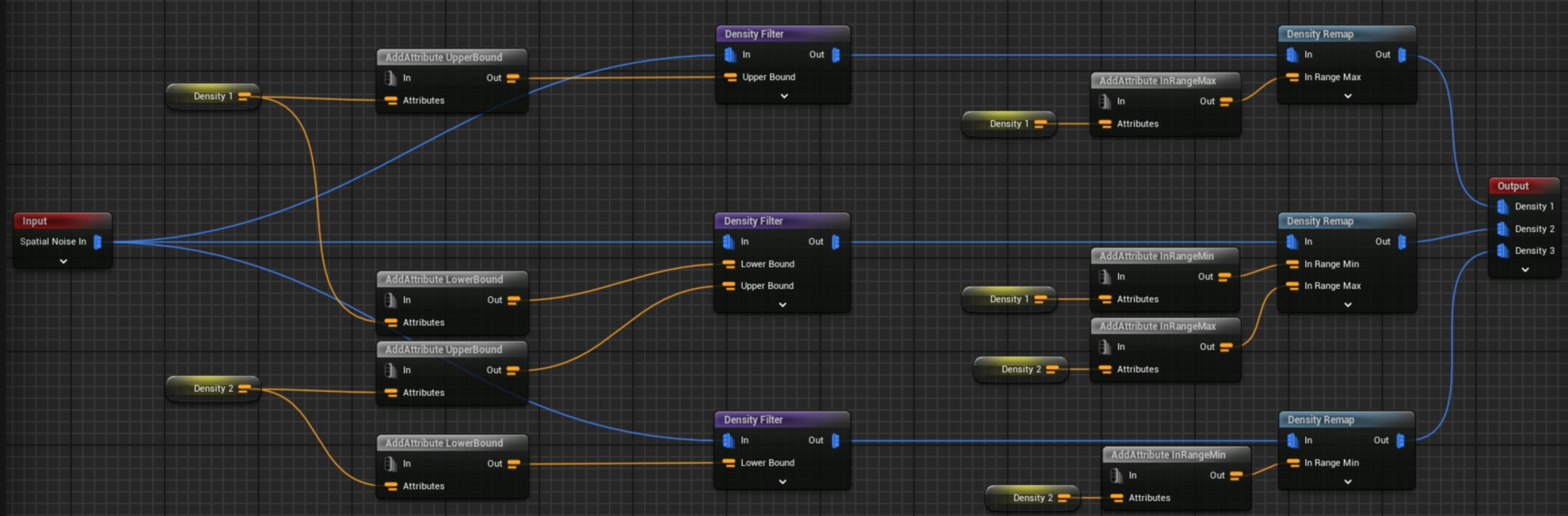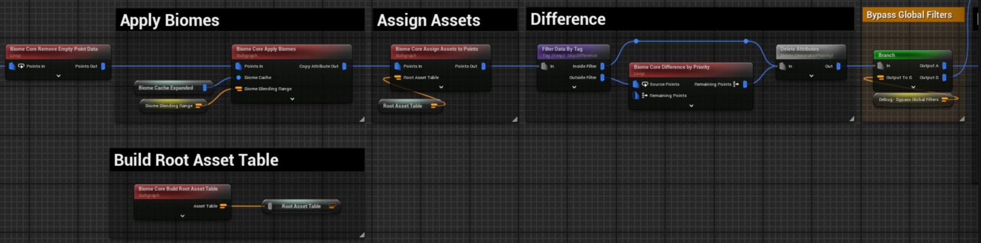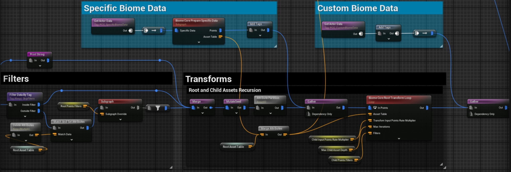 There are various ways of generating and distributing the various landscape elements such as trees, bushes and tufts of grass, etc. For example, you can use filter functions to filter out points for generation, organise PCG graphs in a nested manner via subgraphs, or simply create new offshoots in the PCG graph, each of which then has its own functions and generates additional mesh types.