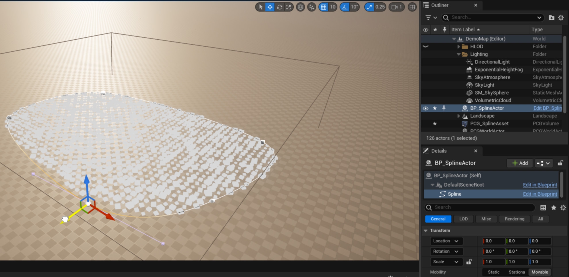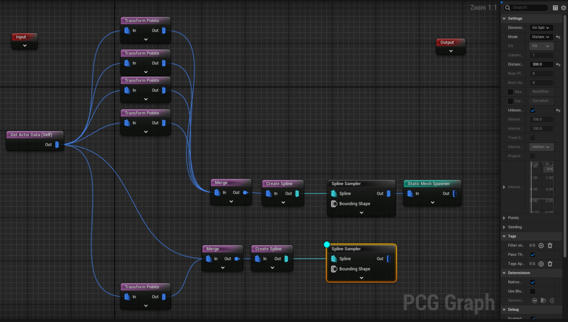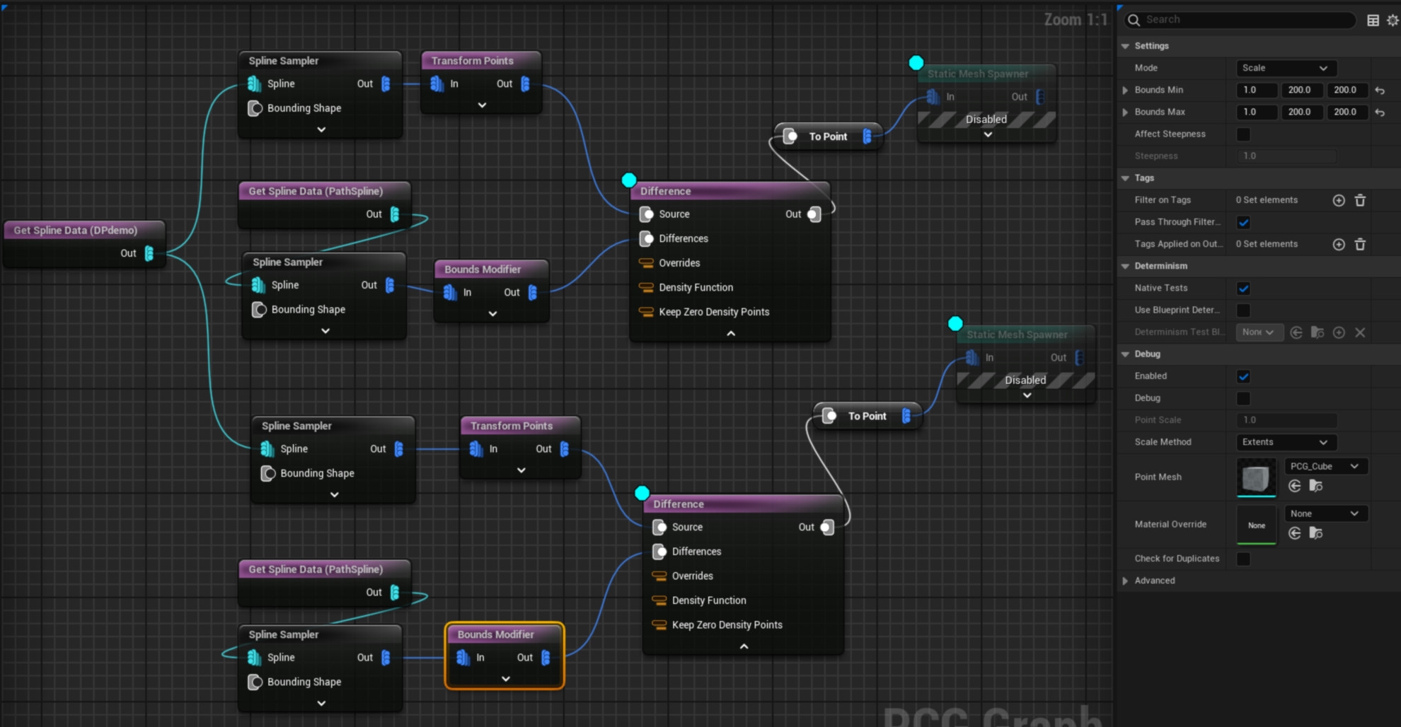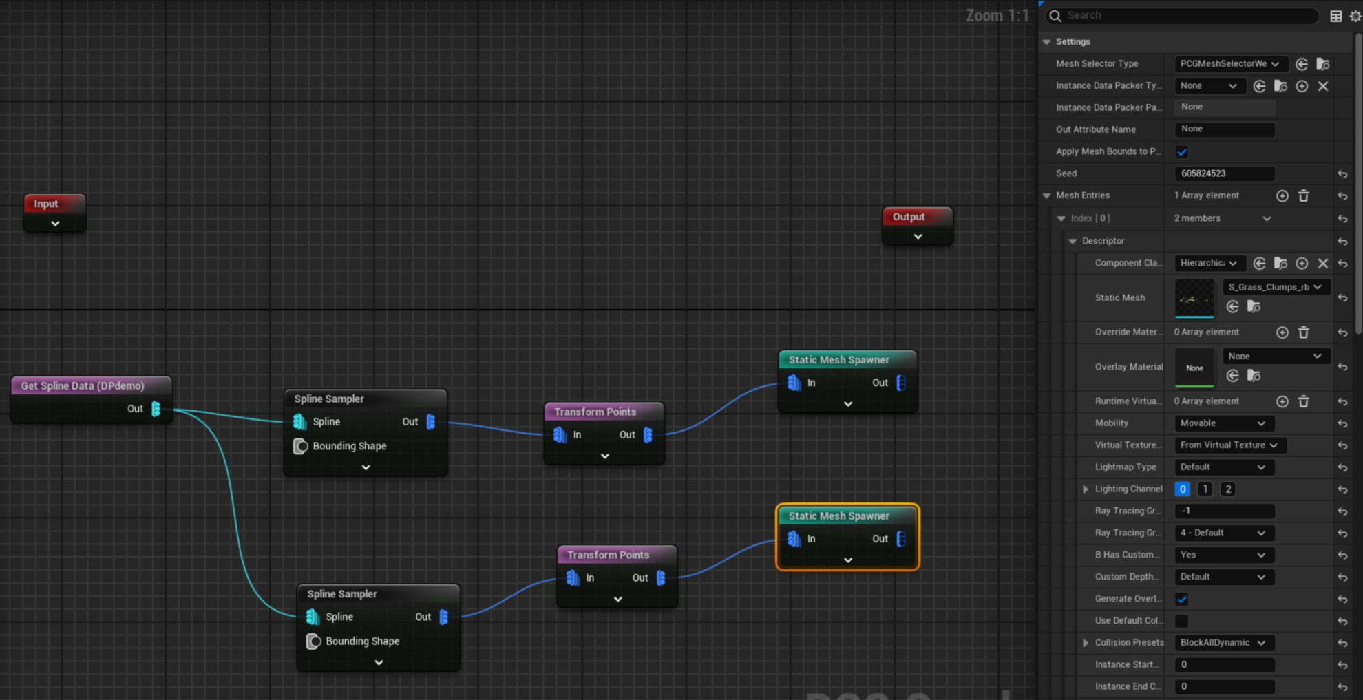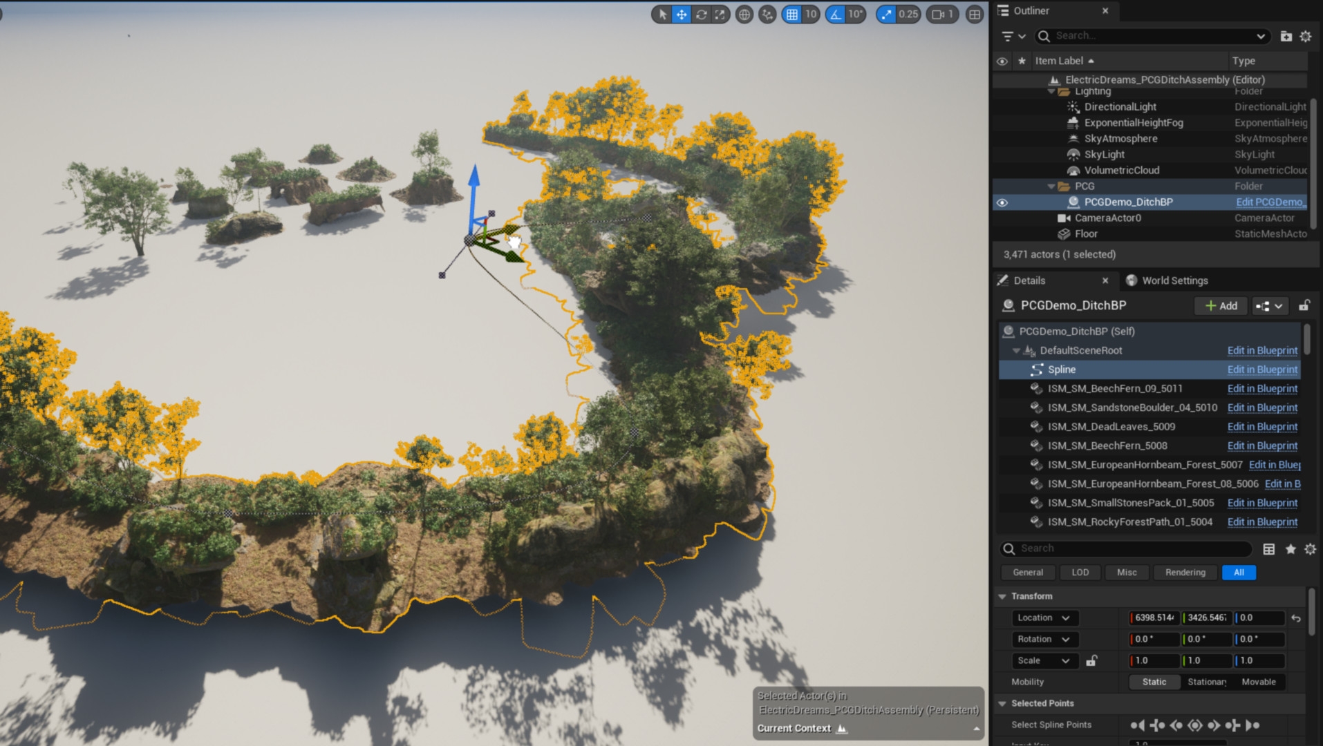 The PCG building blocks: Quixel assets as compunds and then as “Packed Level Actors” blueprints, which can be controlled via details parameters and spline curves