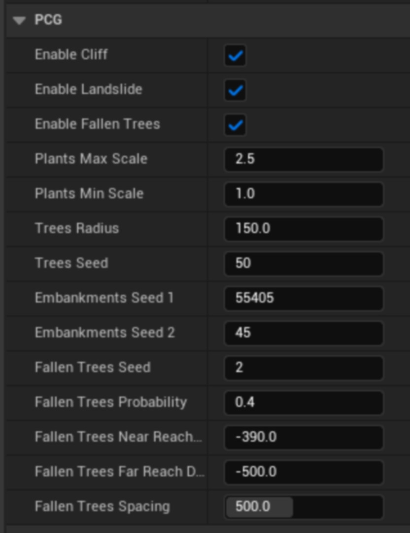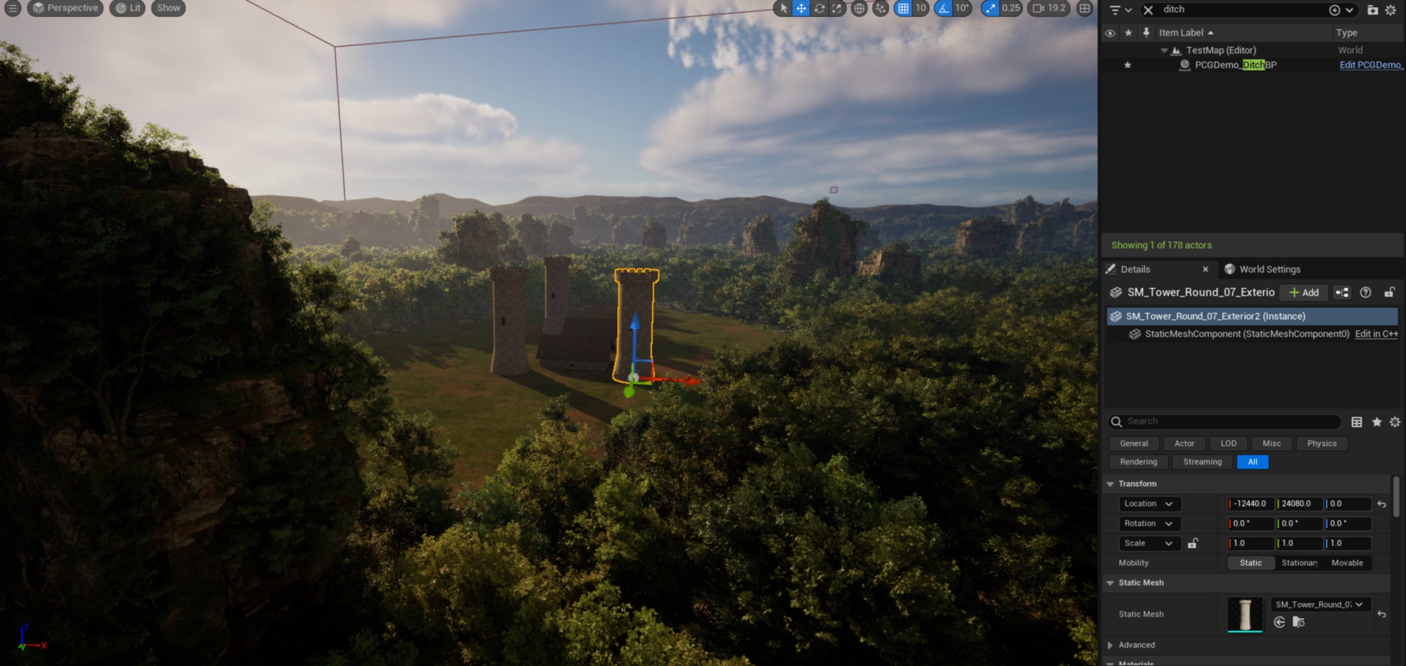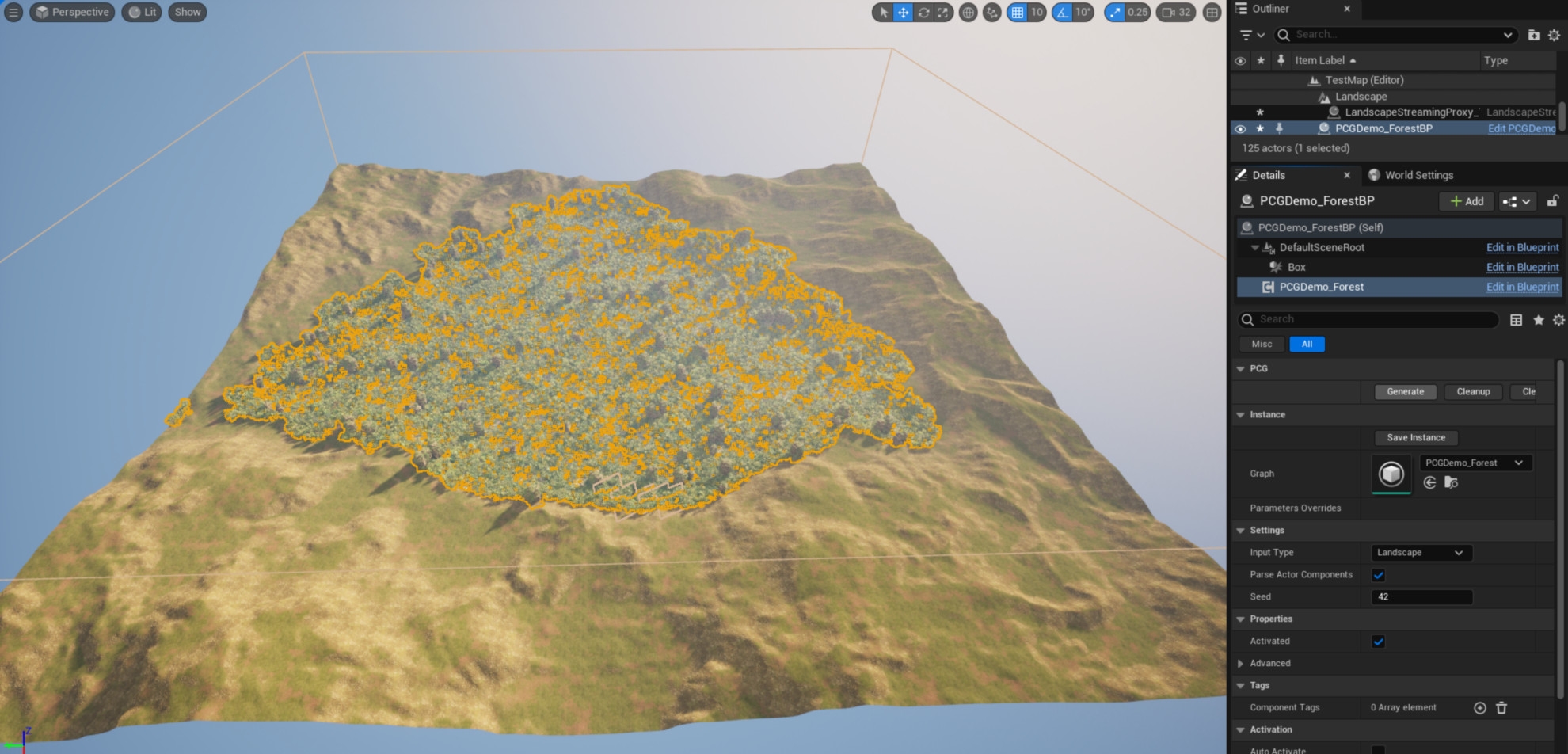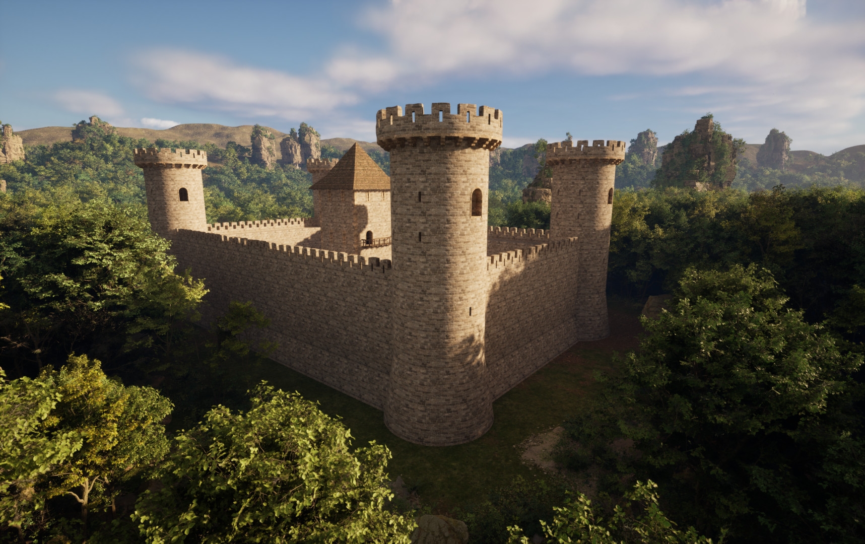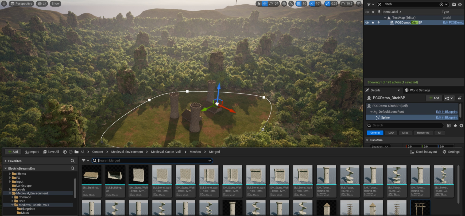 A PCG scene setup in a quick test with assets from the Electric Dreams demo. Create forest, define recess via spline, add modular buildings. The castle with forest surroundings is finished.