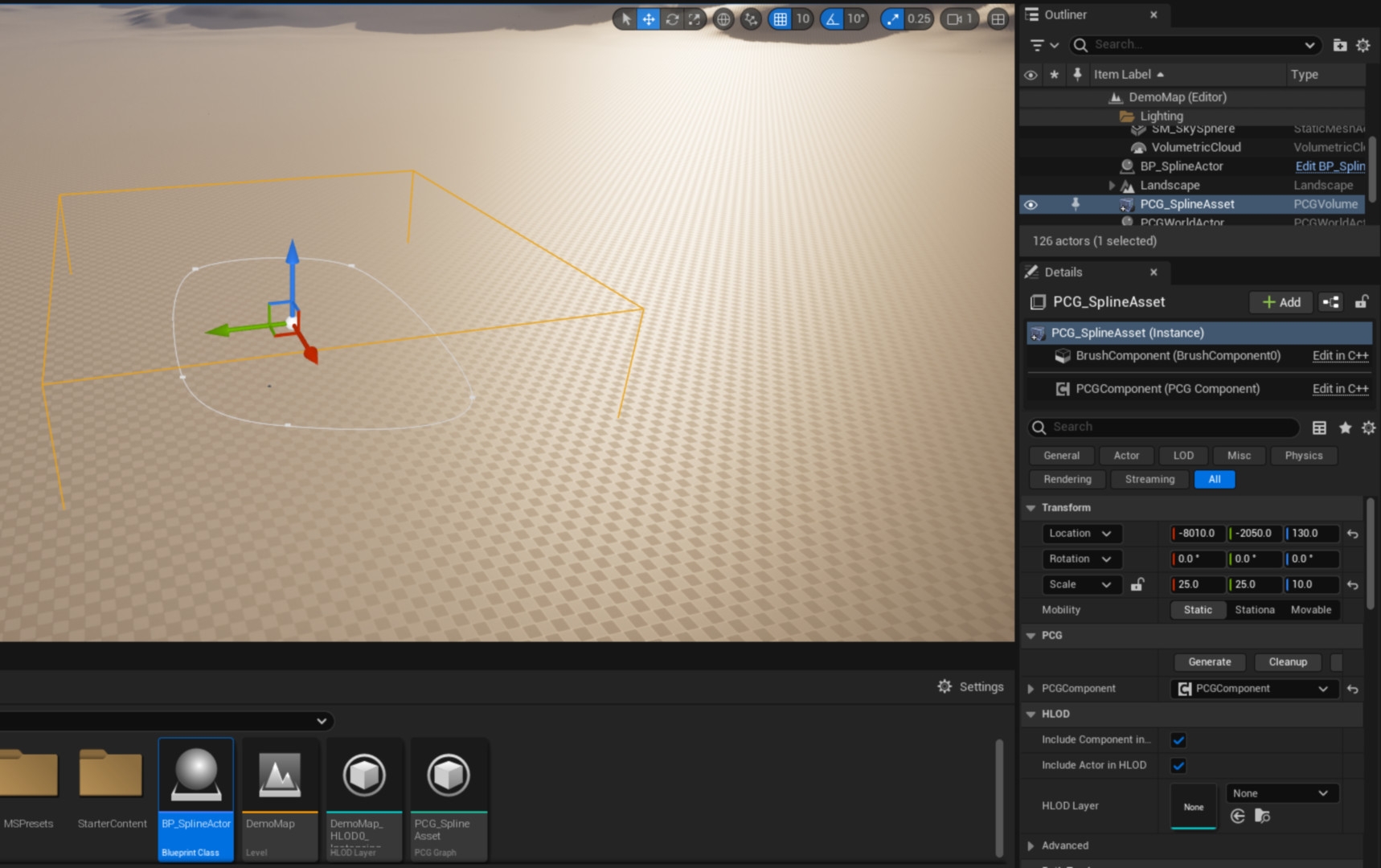 To rebuild PCG Actors from scratch, the PCG plug-in must first be activated. A new scene with PCG Graph, which is placed as a volume in the landscape, is then created via the PCG entry in the Content Browser right-click menu, for example. The Blueprint Actor is now added as an additional element, which in turn contains a spline curve as a component that can now be addressed via a tag.