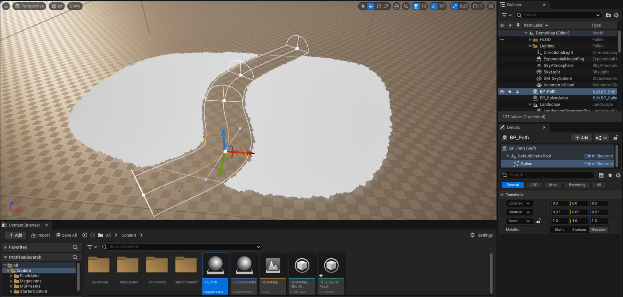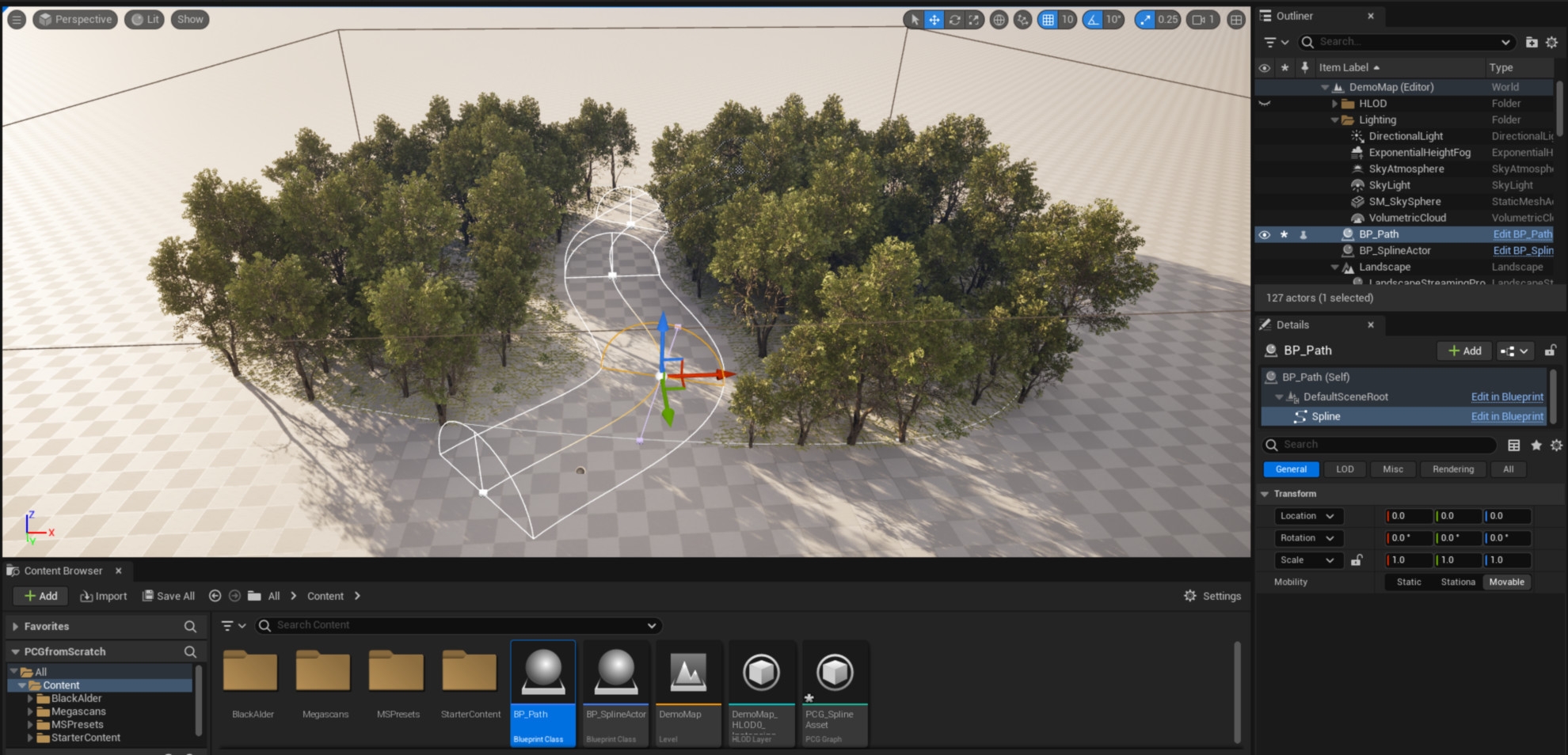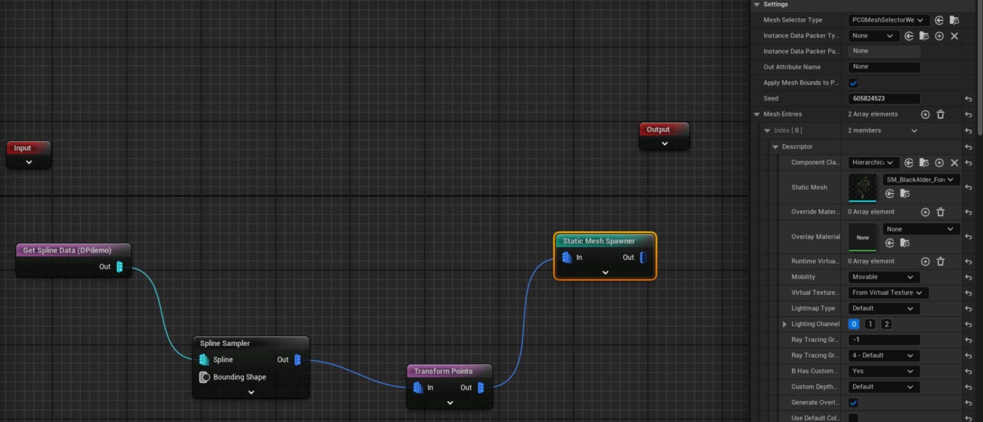 BU PCG right from the start: PCG volume and blueprint actor with spline, preview of the point distribution via debug mode, Quixel Alden trees as mesh output at the point positions. Then added a branch for grass detail and small bushes. Then to clear a path in between, a Blueprint Actor with Spline and Bounds modification via Difference Node from the previous one