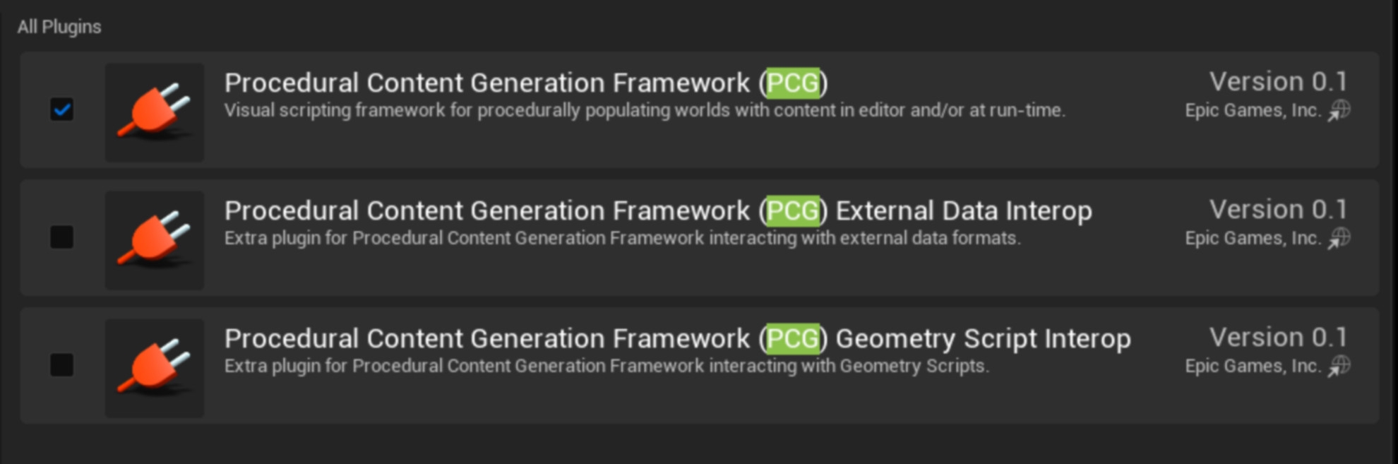 The PCG Engine plugins, PCG demo user parameters in the detail window and the PCG graph of an assembly.