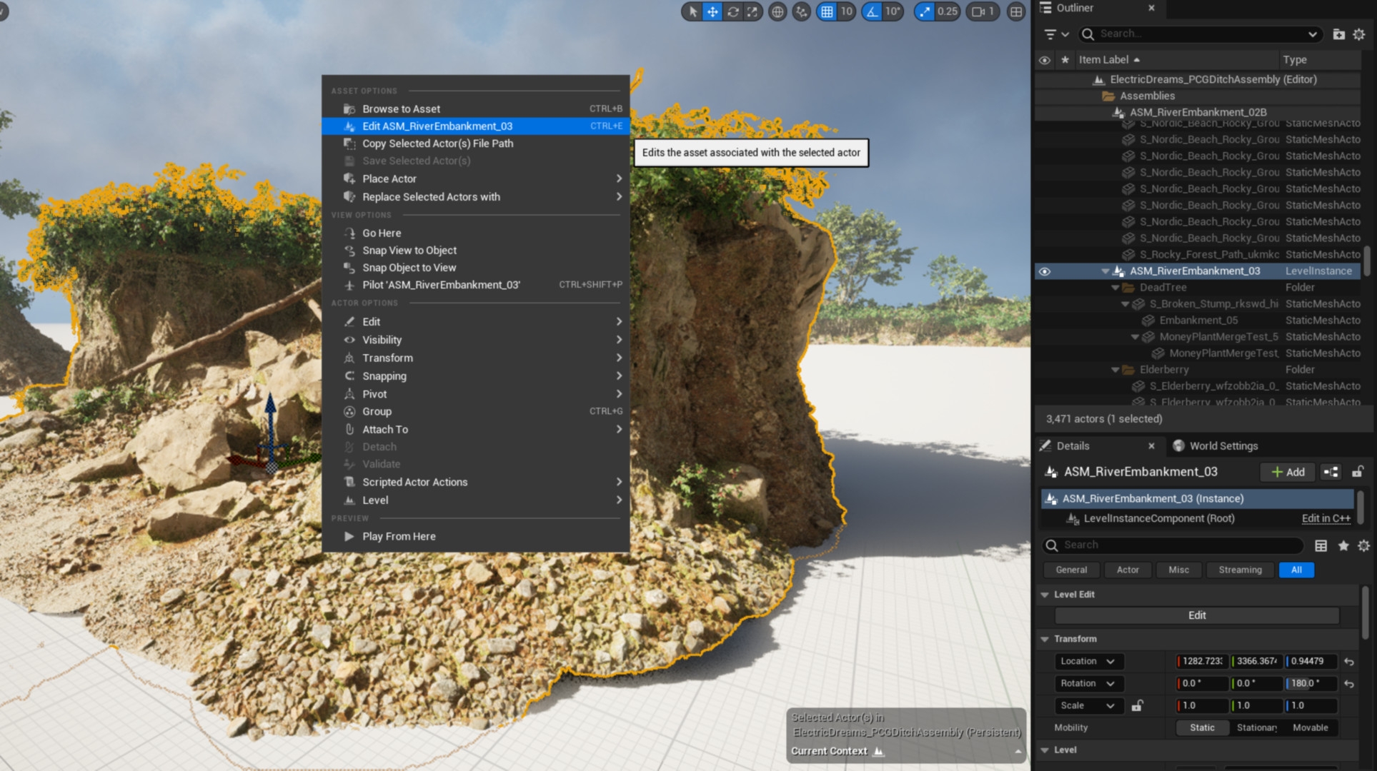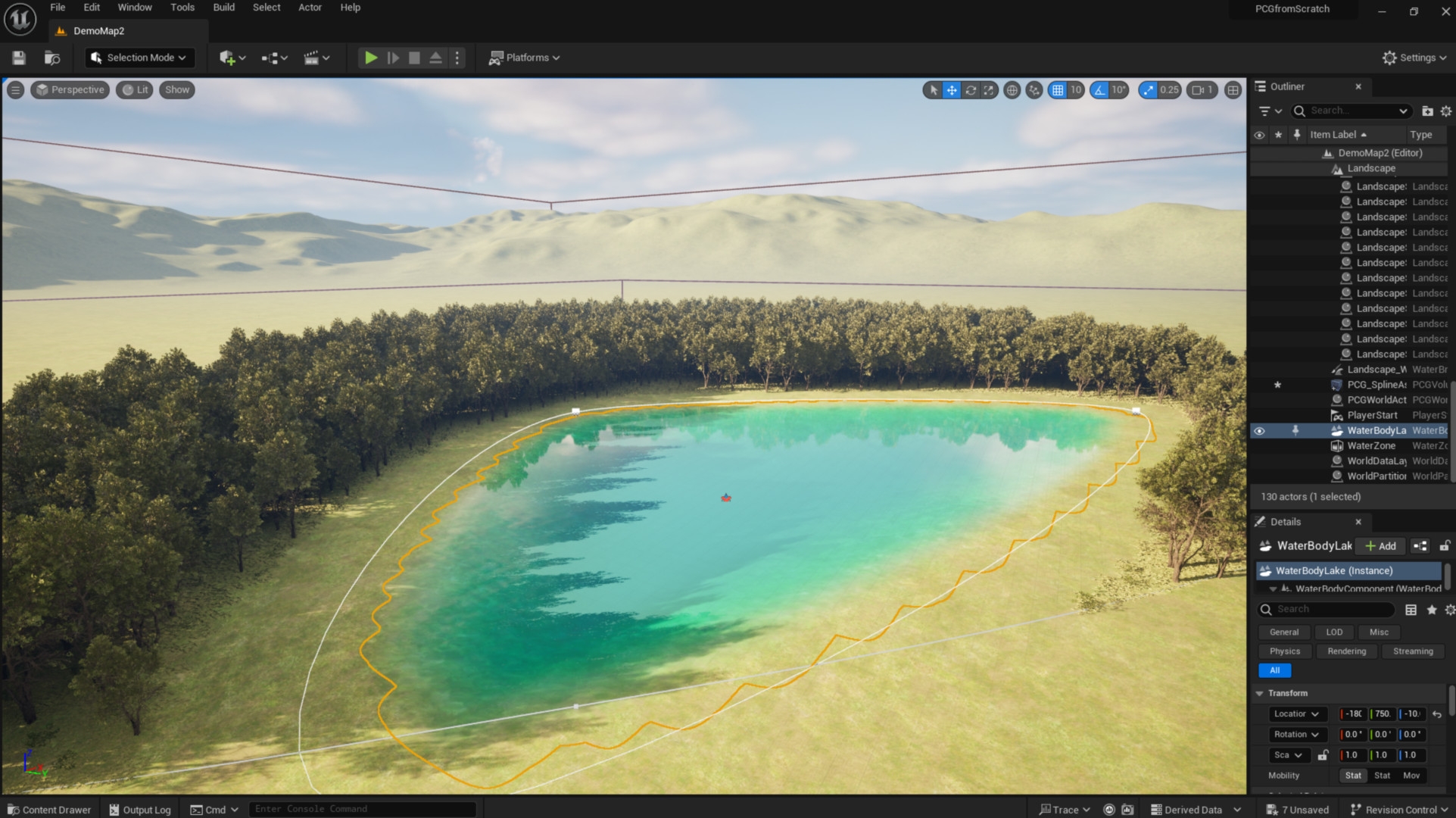 Other components from the Unreal landscape system can of course be perfectly combined with PCG Graphs, such as the river, lake and ocean elements of the Unreal Water plug-in. Once activated, the water landscape parts are now available and as the lake and river have inbuilt splines to shape the form, these can of course also be accessed via the PCG Graph.