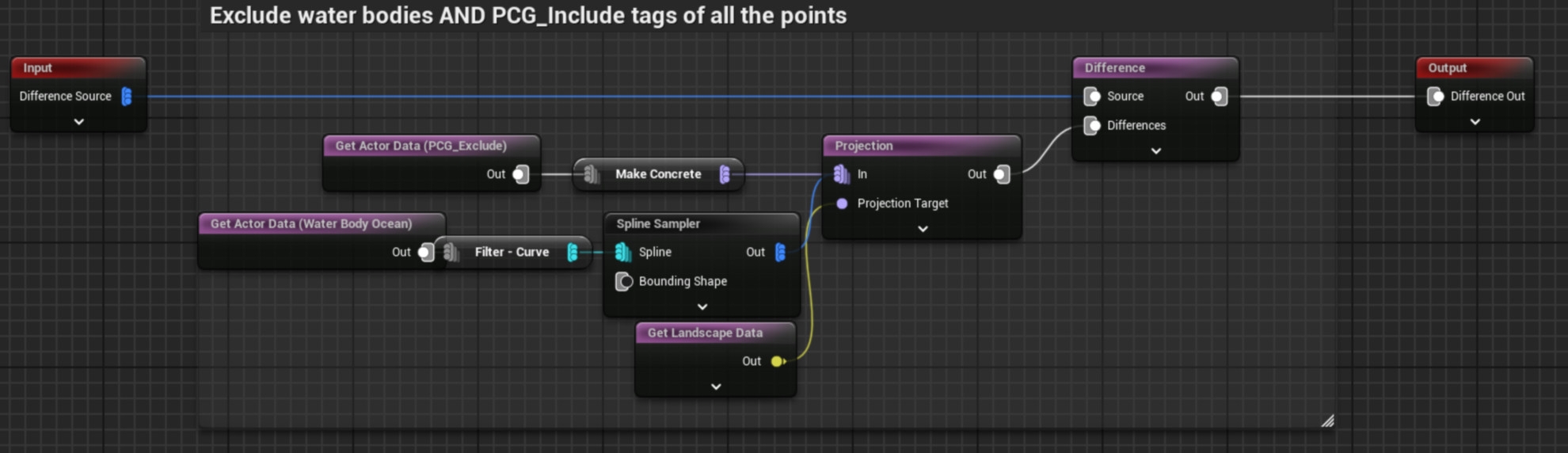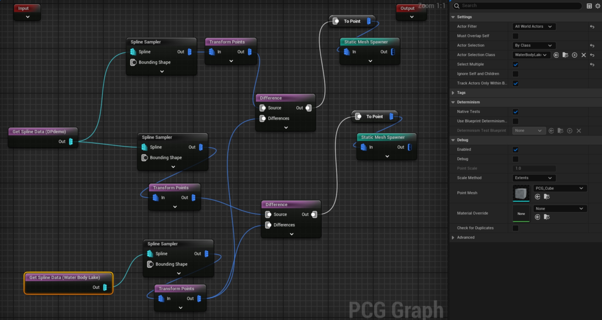 For example, if you now place a lake (Water Body Lake) in the scene, you can now call it up in the PCG Graph via get Spline Data by defining All Actors of Class as the selection method and On Interior in the spline sample. The generated point mass must now be expanded slightly via Transform Points scaling and subtracted as before, so that the piece of forest in the landscape is then dynamically pushed back.