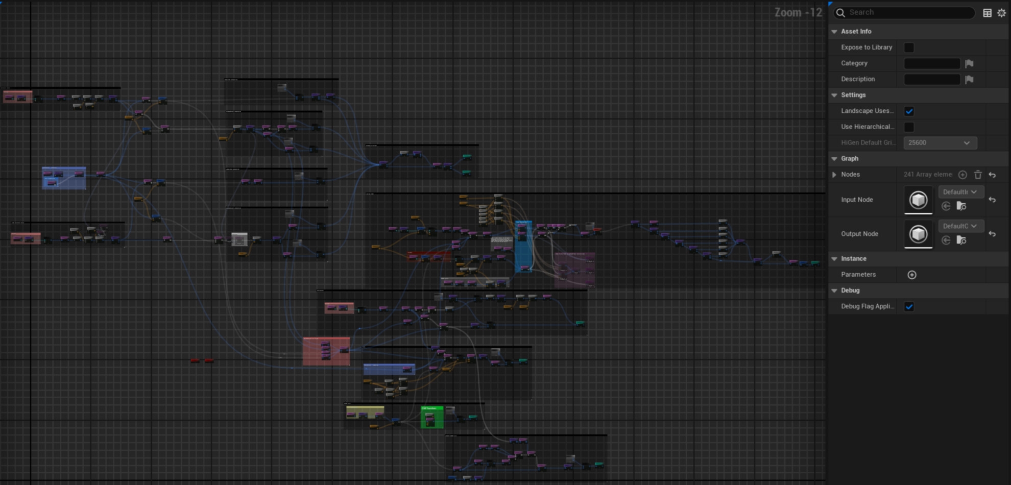 The “Basic Forest” from Hyper in the island demo. With a “World Ray Hit Quarry” the surface information such as rock or grass area is retrieved via Unreal Physical Material. In the PCG main graph, the data flow passes through the packed subgraphs, including the exclude subgraph, until the points are passed through filter transformation to mesh generation. The frequently used “Self-Pruning” node excludes overlaps. In the subgraphs shown below, you can see how the data is formed from the “Density propagation”, the custom user parameter “Density” is integrated for control and the excluded landscape parts are sorted out via Difference.