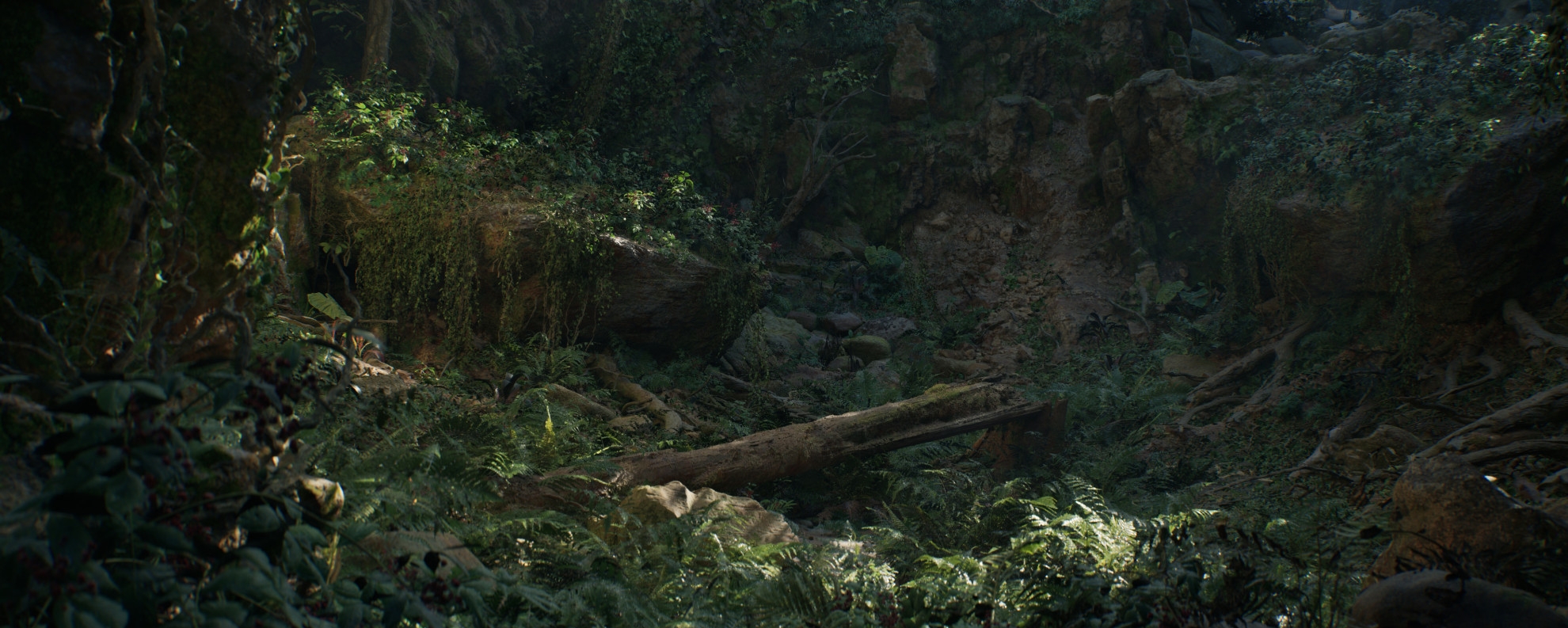 An overview of the Electric Dreams jungle with the alternative viewport views: Lighting only, Wireframe and Nanite Instances.