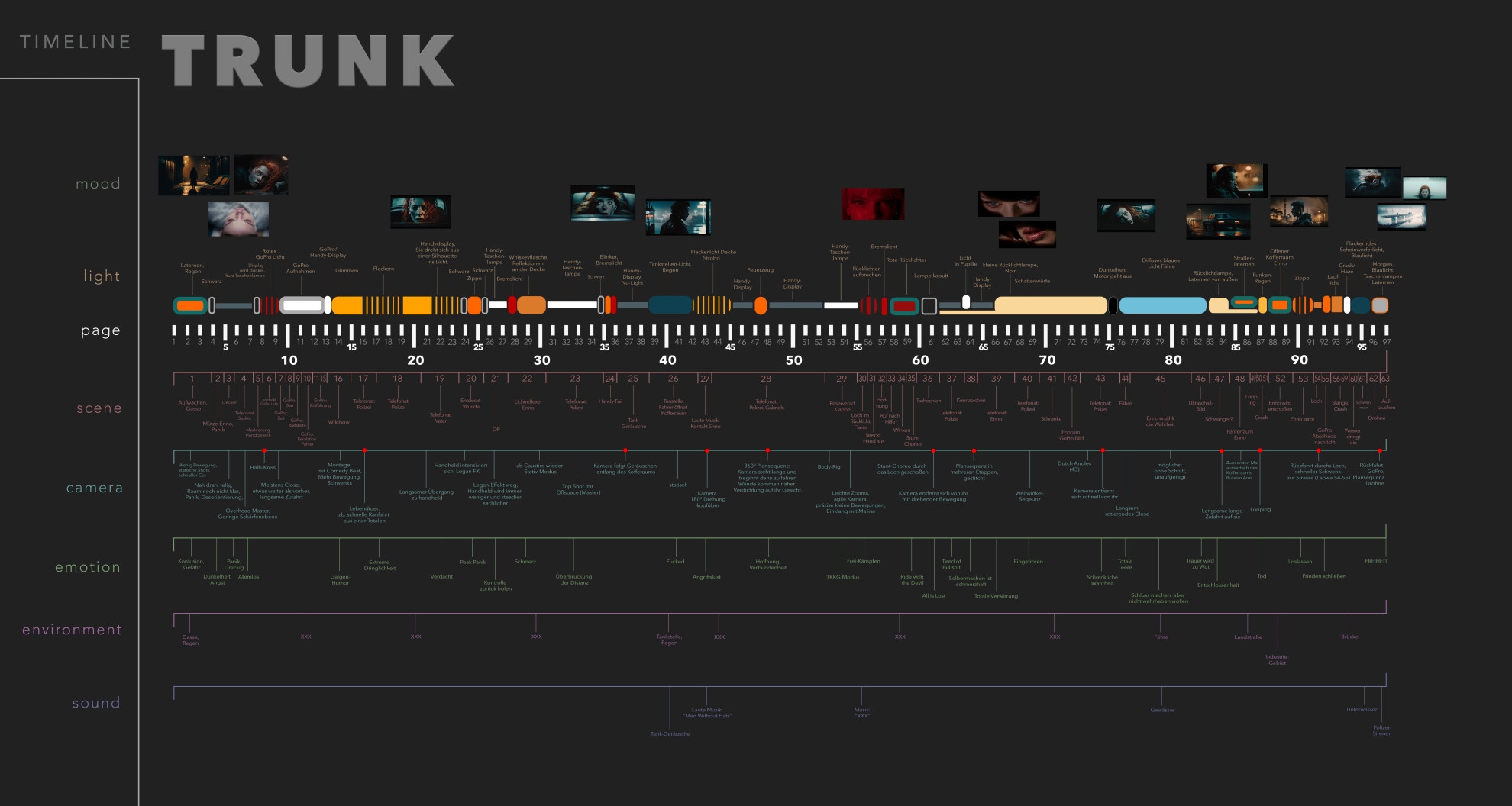 We used this tool for the first time and utilised it specifically for TRUNK. Because in this single-location thriller, we have no variations through changing motifs and gigantic outdoor sets; on the contrary: all variations had to be artificially created by us, everything takes place in one place and we only create variation through the things that we specifically create. There is little to no room for “lucky accidents”, which we were often able to experience in previous projects with changing outdoor motifs.