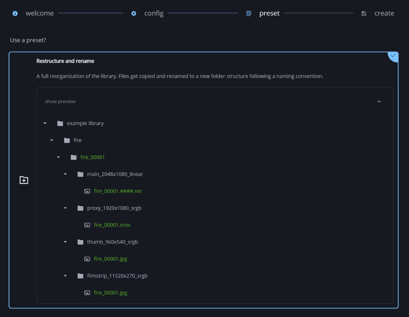 The initial setup of the asset libraries has been simplified. Different presets for different setup scenarios can be selected at the touch of a button. The existing structure can be retained or all files can be reorganised. Control over storage locations and methods is now faster and more flexible than ever before.
