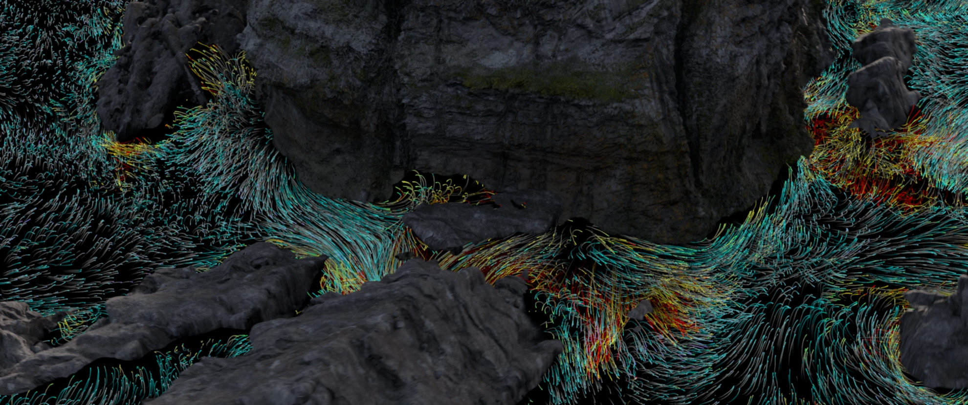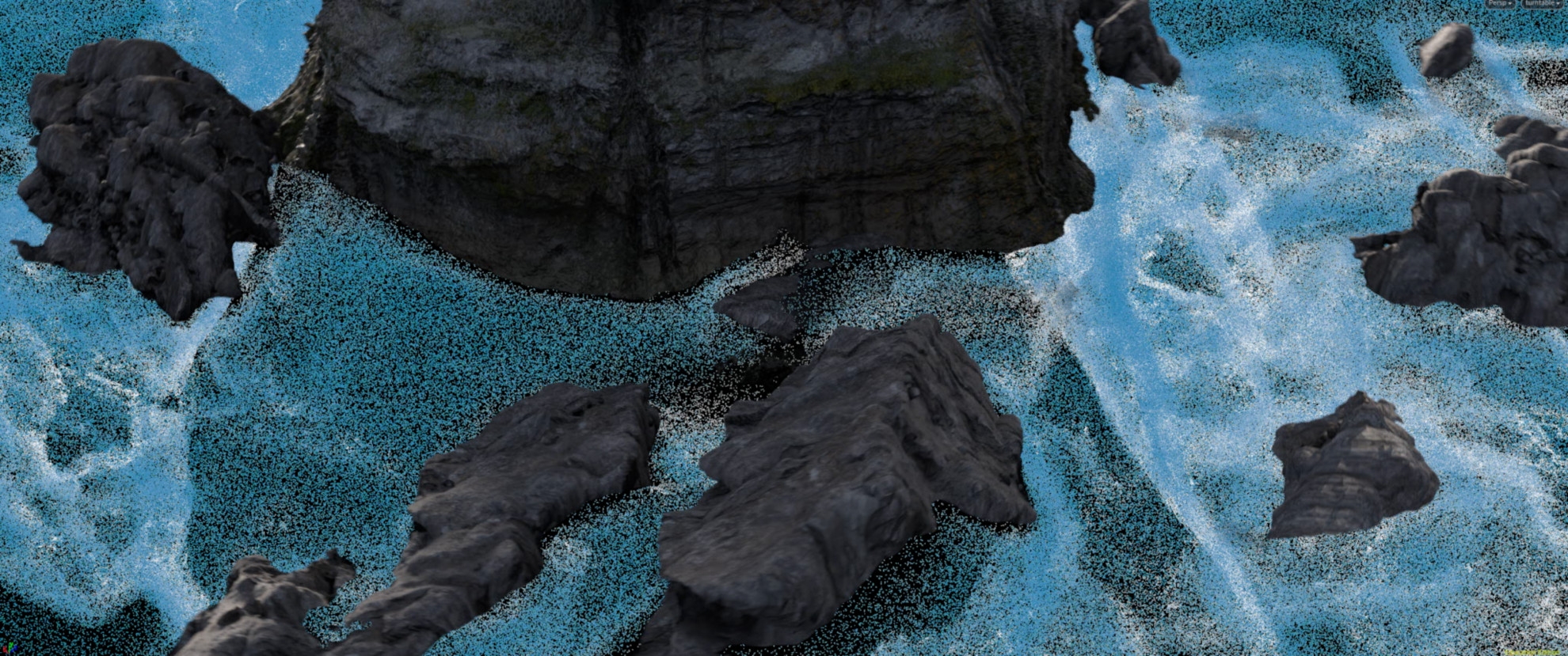 For high efficiency over the entire process, the simulation area was limited to a small part around the island. This allows a fast workflow even with a high scaling of several million particles. In this area, the input parameters were extracted from the original ocean in order to use them as parameters for the simulation. The level of detail of the water is largely represented by the whitewater, which is then calculated as a function of the water simulation. Not only the water, but also the wind influence the dynamics of the spray. To make the behaviour even more realistic, an airfield simulation was simulated around the island so that the turbulence in the air also works.