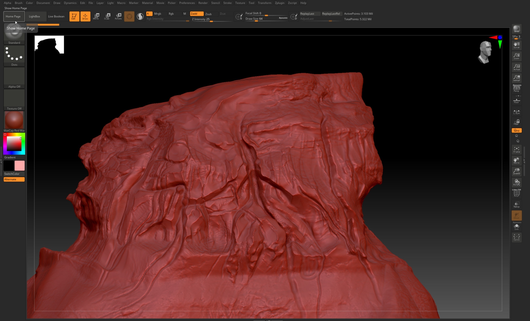 As the final island model was used as a reference for the above-mentioned painting in the film and some other parts of the set design, the island had to be ready several weeks before shooting began. The sculpting of the island was done entirely in Zbrush. Depending on the concepts, a rough silhouette was first defined, then smaller details were worked out. With the exception of the details in the rocks, the entire island was sculpted completely by hand and without procedural aids.