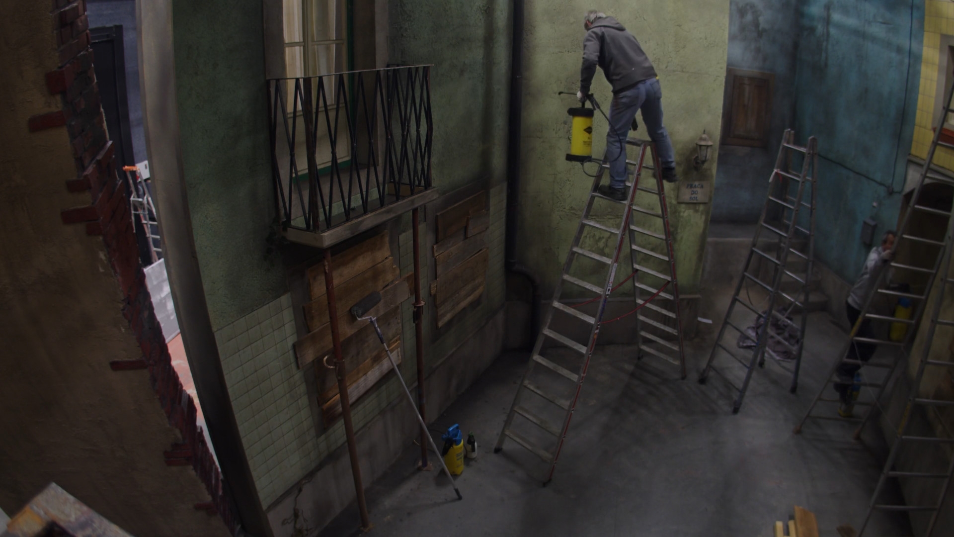 The challenge for the visual effects design was to achieve a photorealistic visual aesthetic that blends seamlessly into a real film with real actors. A Portuguese courtyard, built in the HFF studio in the summer of 2022, served as the central set for the dystopian narrative of a family drama.