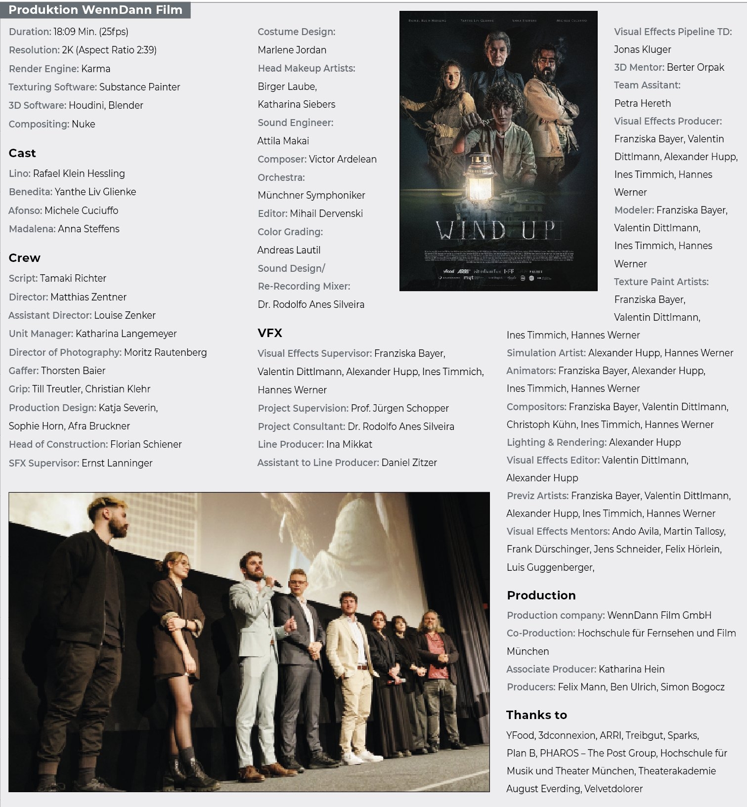 The plot unfolds on an isolated island in the middle of an endless ocean and thematises the conflict between the spirit of discovery of youth and the entrenched convictions of the older generation. Although officially listed as a “VFX film 02” by the visual effects students, “Wind Up” is a joint project. For example, screenplay student Tamaki Richter wrote the script, while the production was handled by WennDann Film GmbH, which was founded at the HFF, and students from all departments took on additional roles – wenndann-film.de.