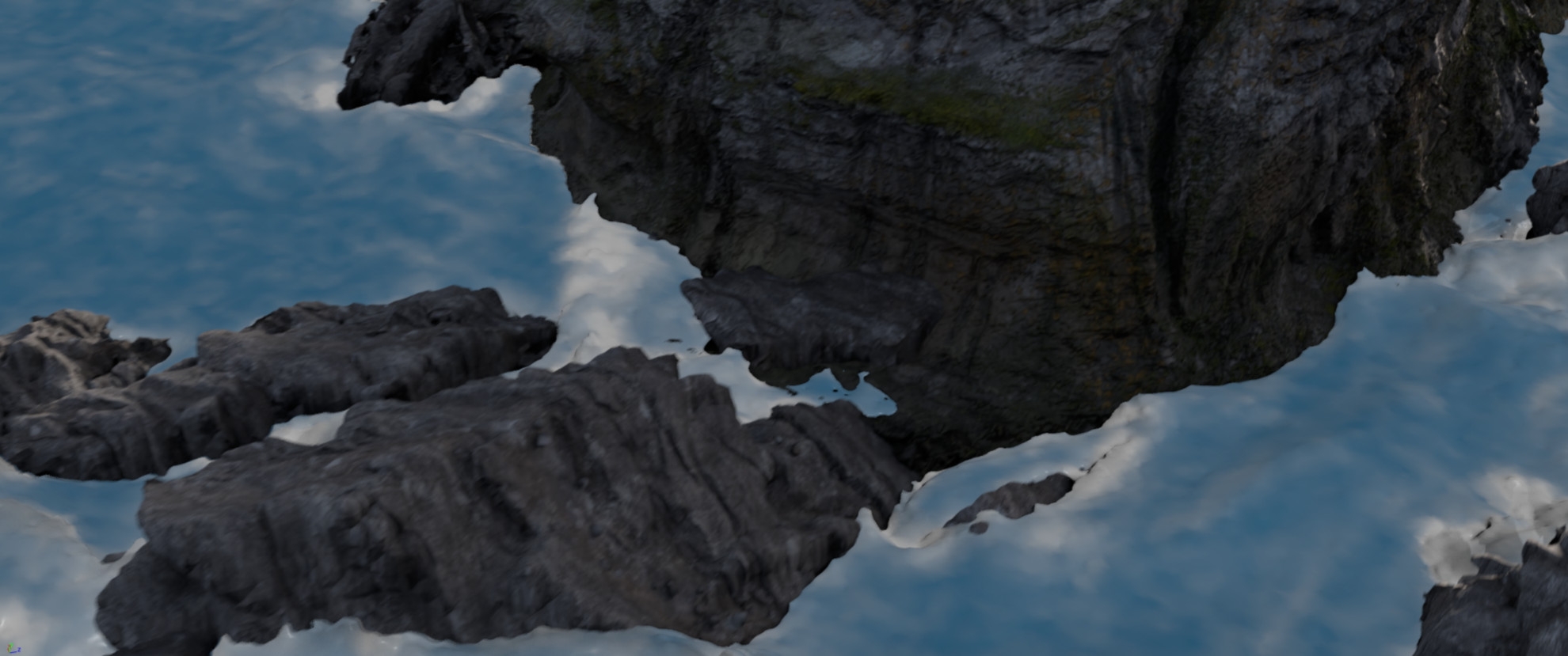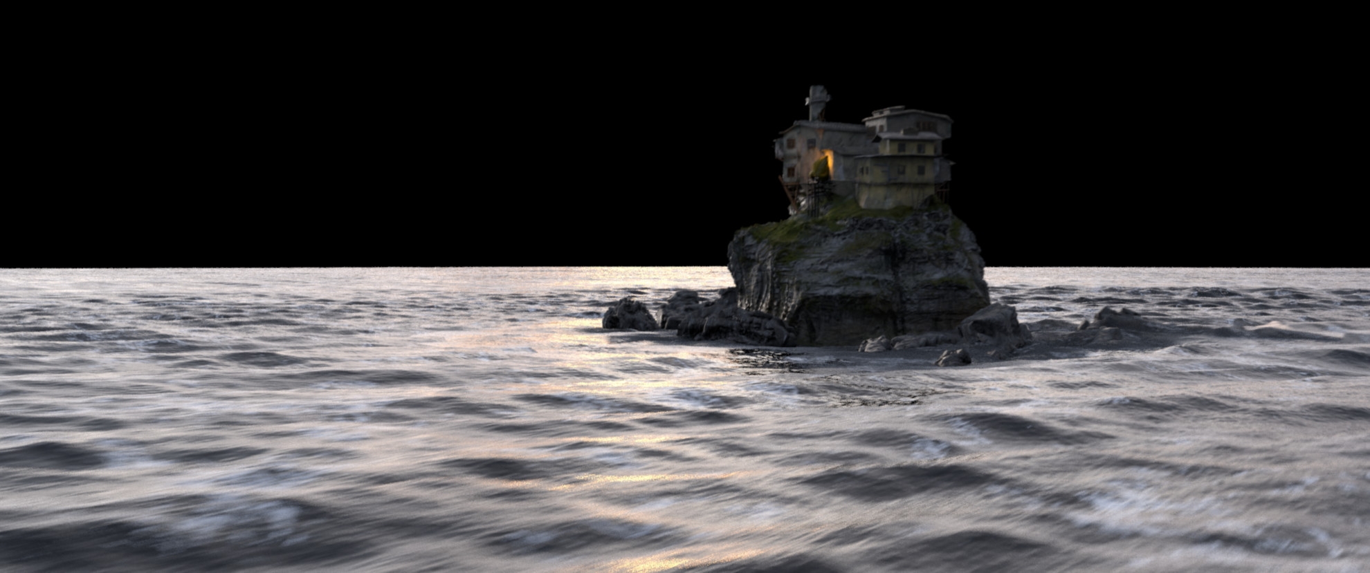 The loneliness is mainly told through the huge and empty ocean in the background. The interaction between the water and the island was one of the biggest challenges in achieving a realistic end product. Like the balloon, the water in Houdini was also simulated and shaded. The latest FLIP solver was used to calculate the base water.