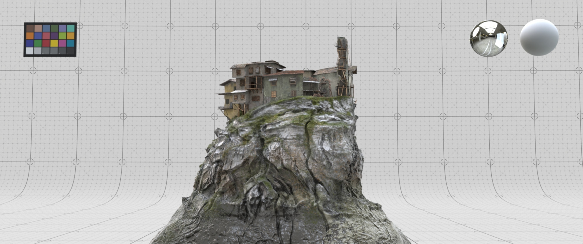 The story takes place on an island threatened by decay. Wind and water have reduced the piece of land, which was once richly populated, to a minimum. A sparse amount of dilapidated houses are the last thing left on the island, but even these will not last much longer. The house assets were divided into five complexes before filming and arranged based on the set scan. An attempt was made to create a recognisable silhouette by varying the heights of the buildings and a tower whose top had been broken off. After the shoot, the models were refined in Blender and customised with Kitbash assets.