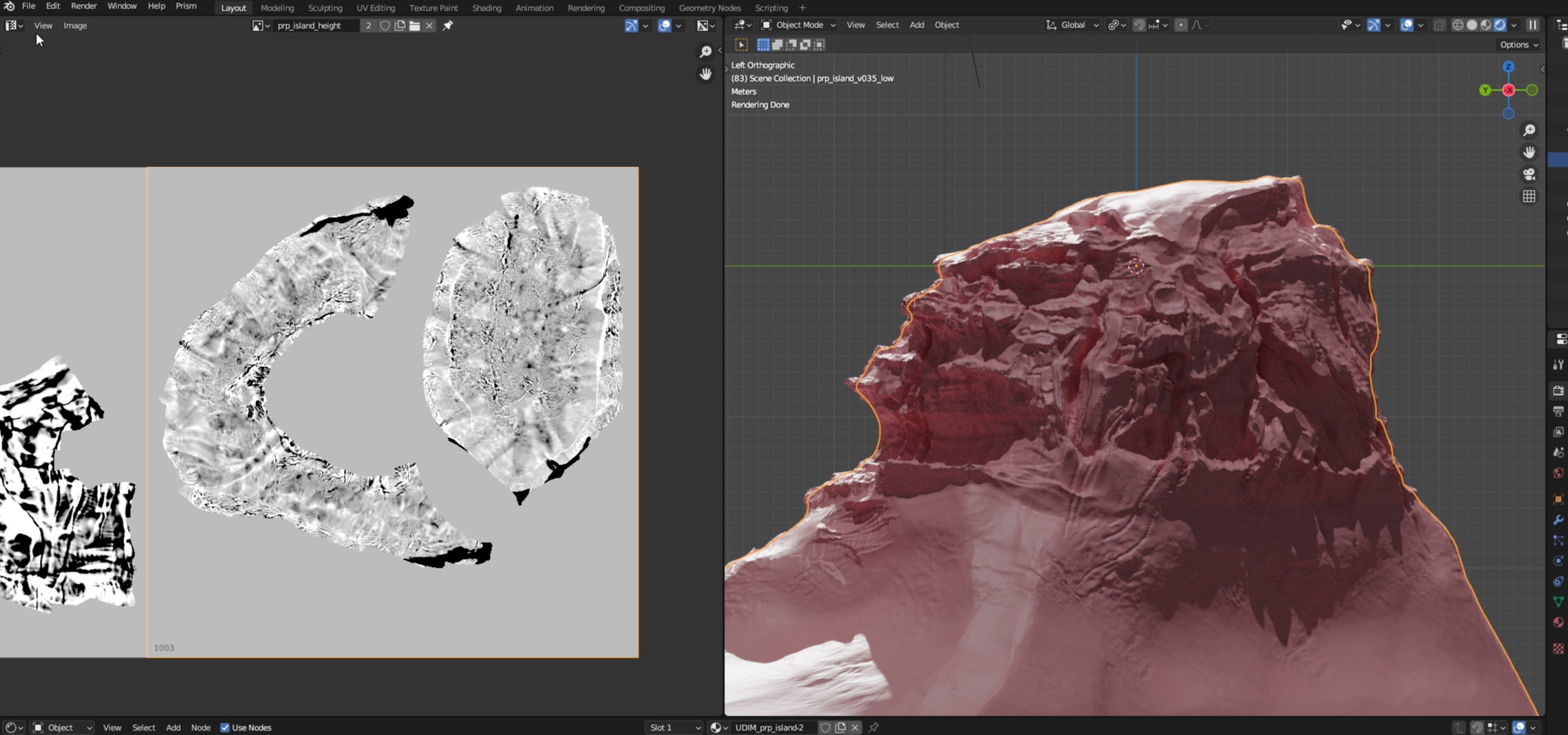 As the island model in Zbrush ultimately had a very high resolution of over 4 million active points, a lower-resolution duplicate of the base mesh was created, which contained fewer details and would speed up the further texturing process. This mesh required less computational work in programmes such as Houdini or Substance Painter and thus facilitated the entire work process. In Blender, the low-resolution mesh was UV unwrapped. The high-resolution mesh was then projected onto this reduced mesh in Substance Painter in order to retain all the details of the original model in the maps generated in Substance Painter.