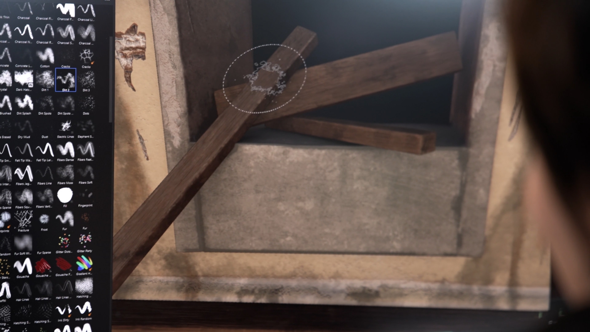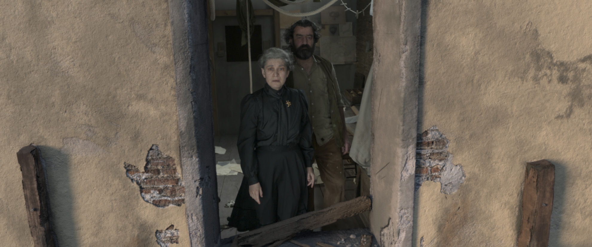 As the houses were almost only shown in supertotal shots, it was possible to keep the models low-resolution with only around 100,000 polygons. The roof tiles, for example, were not modelled individually, but were just flat roofs onto which roof tile textures were projected. However, for two shots in which one of the house walls was used as a set extension, a detailed asset with 338,394 polygons had to be modelled. When texturing in Adobe Substance 3D Painter, the wall colours, as found in the set, were adopted and digitally patinated using various layers. Stains and elements that contributed to the worn, dirty look were painted by hand.