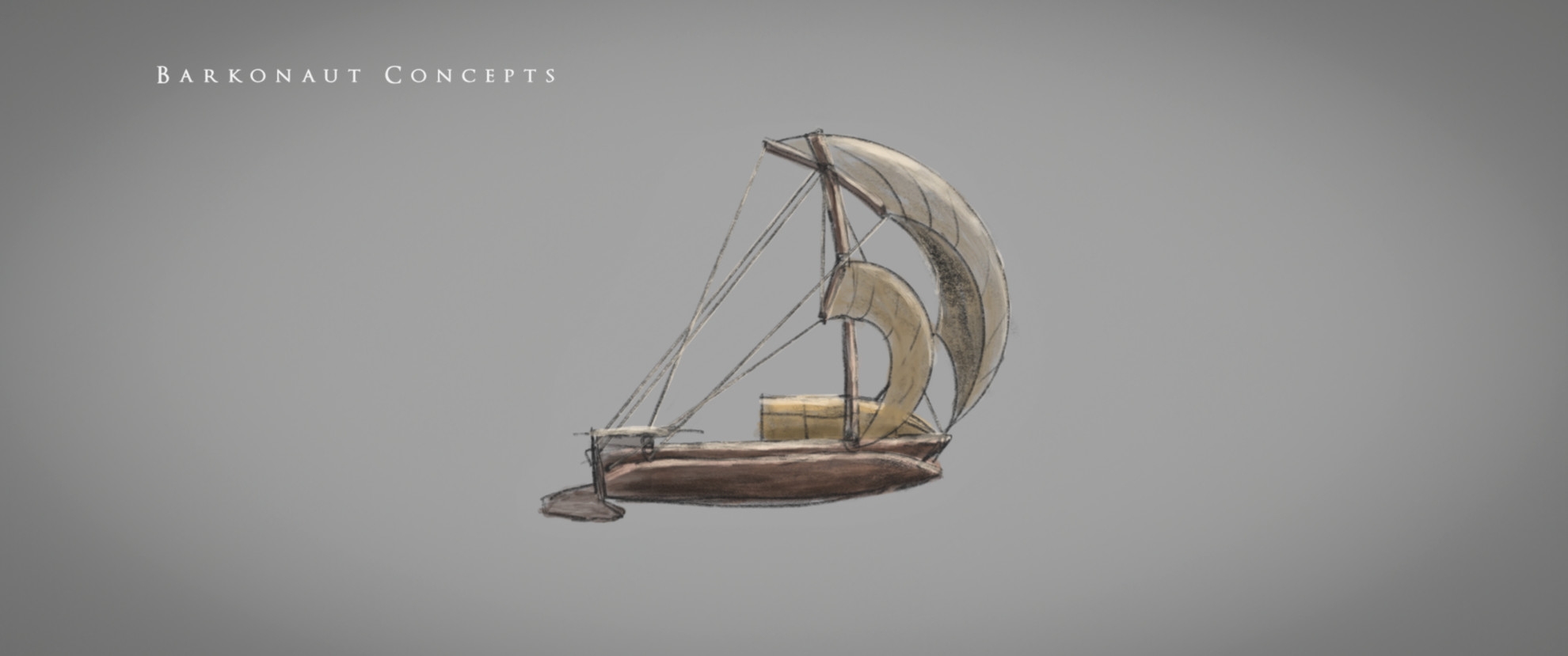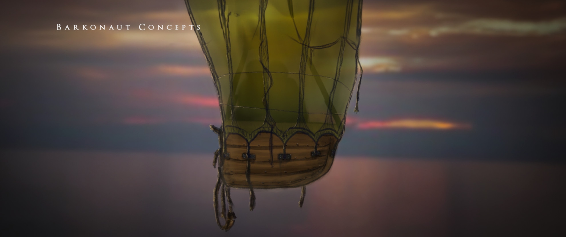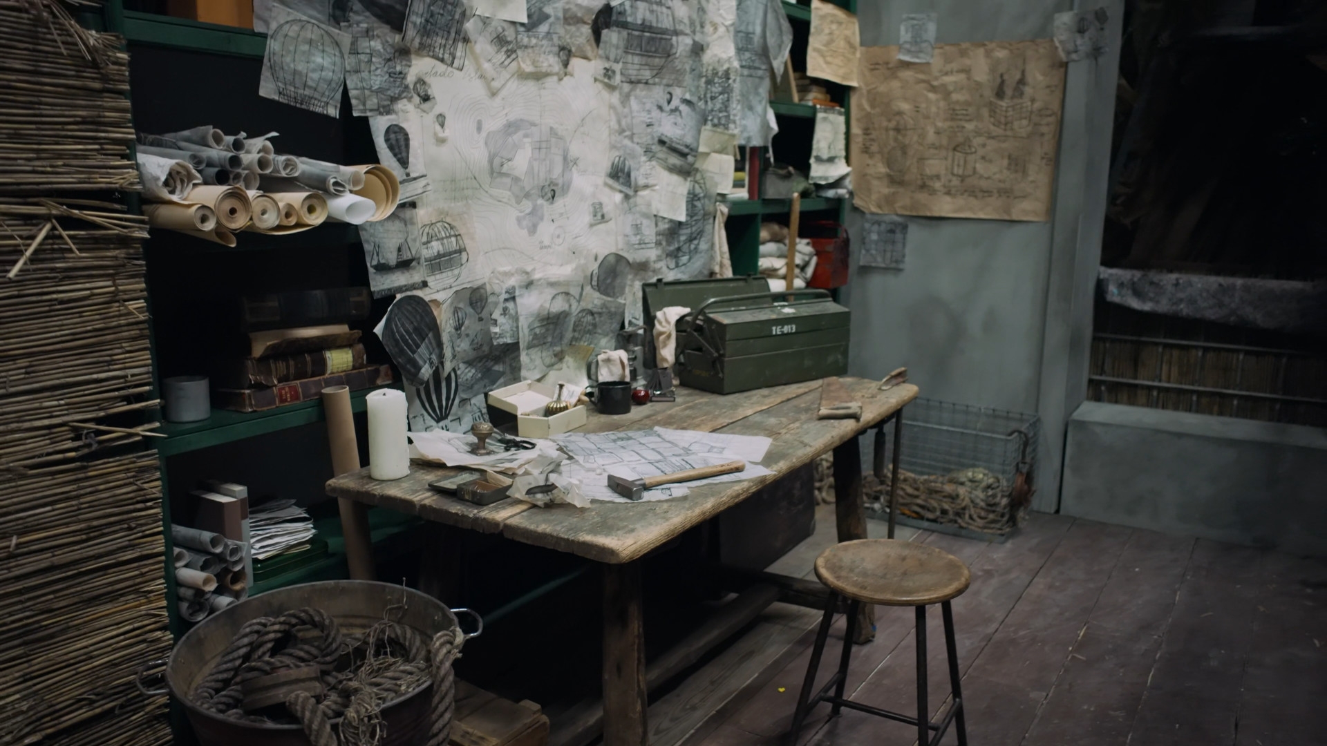 The composite appearance of the vehicle, made from washed-up components, old planks, nails, fabric patches for the balloon and improvised assemblies in the workshop, gave the “Barkonaut” an authentic character. Artificial intelligence was used to generate construction plans for the barkonaut and maps of the remote island. The images were plotted onto semi-transparent paper and patinated with tea to give the maps an aged look. The door to a secret workshop, a painting of the island, was made especially for the film by painting student Elisaveta Bogushevskaya.