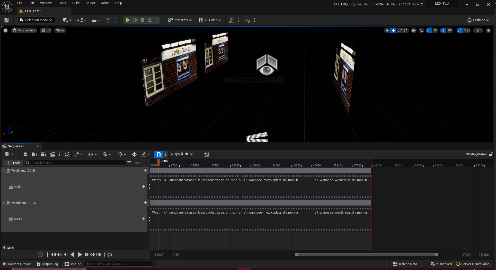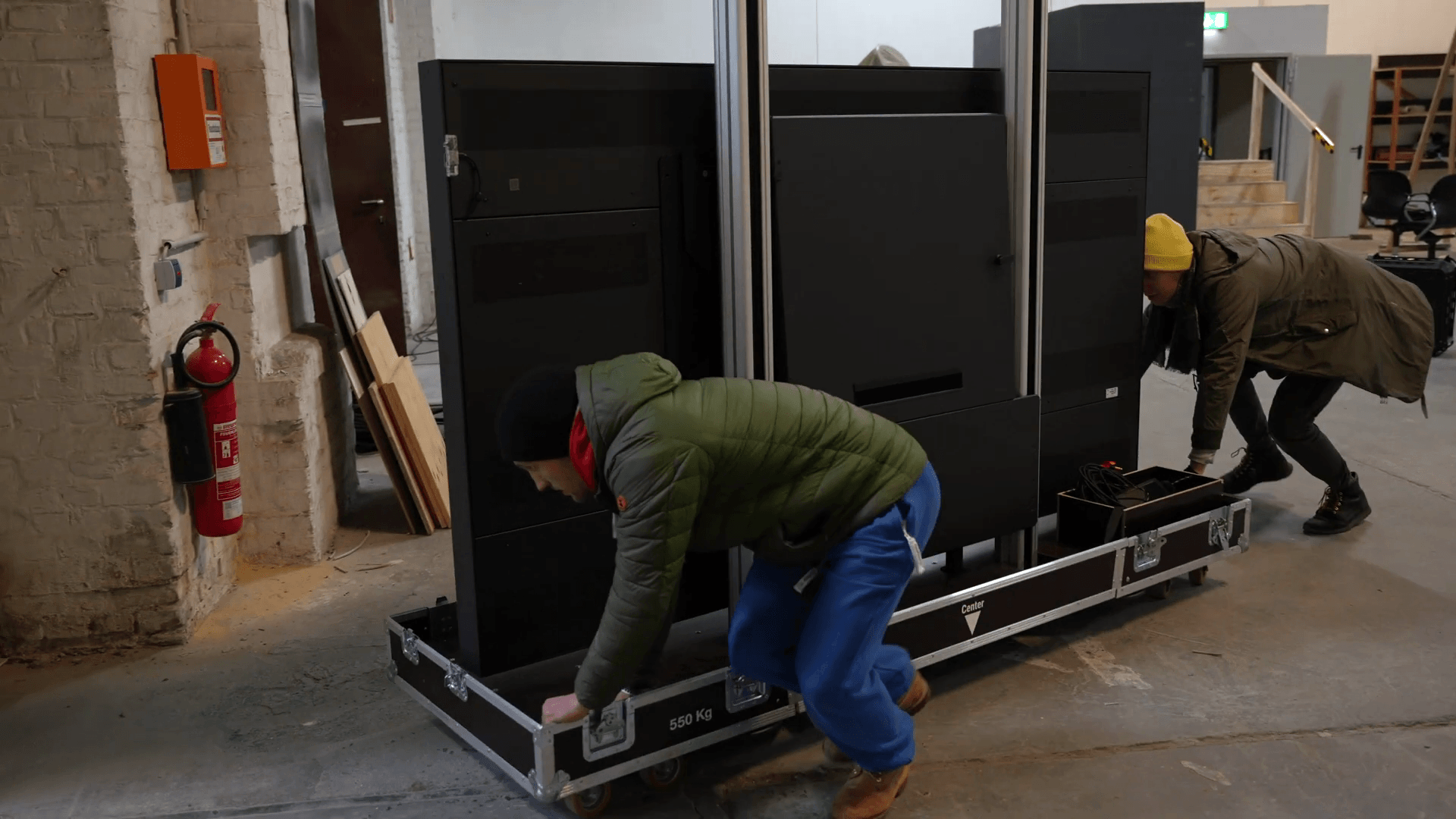 Sven Lehmann: The challenge when setting up the screens was that we had to position two of the three displays on the platform of the S-Bahn dummy and there was very little space around it. We were then able to solve this with millimetre precision using an assembly lift. The aforementioned packaging system for the walls helped us a lot when moving them. When they were raised briefly, they could be rolled, put down again in a different position and then adjusted to the correct height. In terms of realism, the scene was very grateful as it was rather dark.