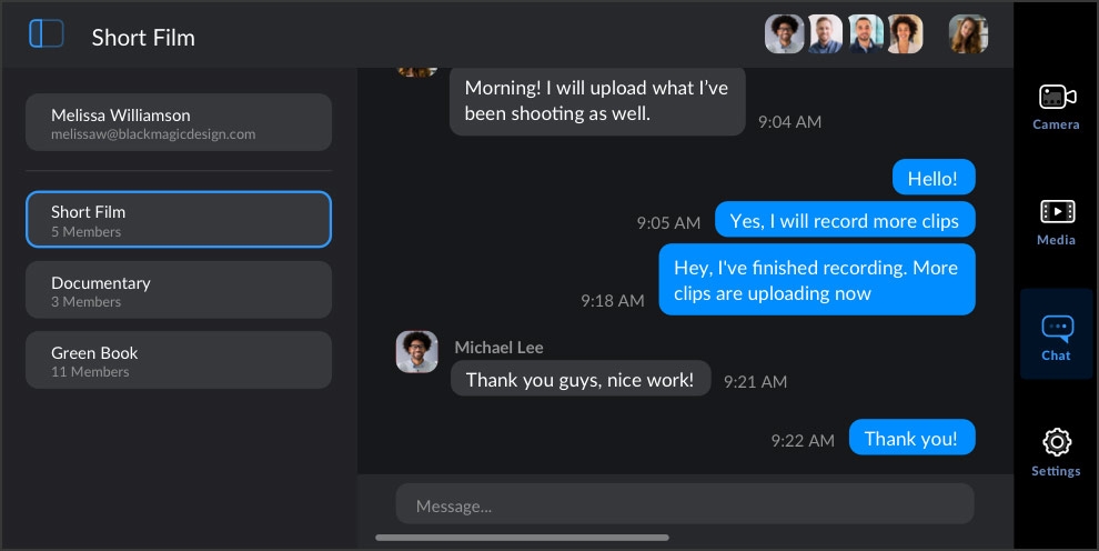 Another useful feature of the Blackmagic Camera App is the integrated chat workspace. This allows team members to exchange information about recordings and give feedback quickly. Everyone involved in a project can see and reply to messages, which makes communication and coordination much easier.