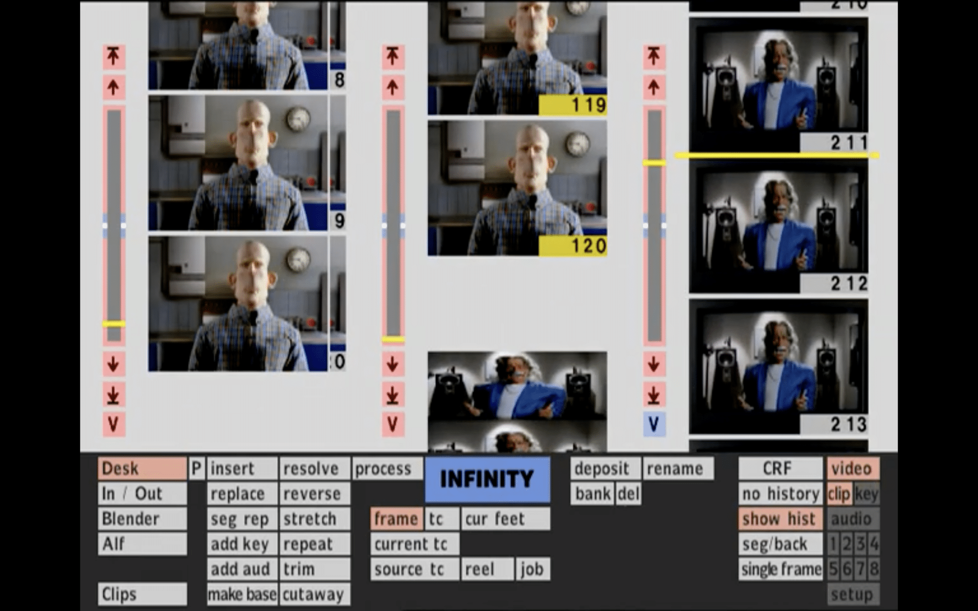 And there was another area where Henry consistently lived out the speed – in editing. Just as there was no node tree, there was also no timeline. Clips were cut together on the desktop in the centre and right reel. This could either be done with “unfolded” clips, where you could see every single frame (realistically a maximum of four frames, more did not fit into the PAL resolution) or with “folded” clips, where every single cut image could be seen as a thumbnail. If you had attached two clips to each other, you could move the cut by dragging the pen up or down between the two clips using a yellow handle. quantel called this technique “gestural editing”. Operations such as fades or wipes (it was the nineties after all) were carried out directly in the Full Screen Viewer or via the menu on the desktop.